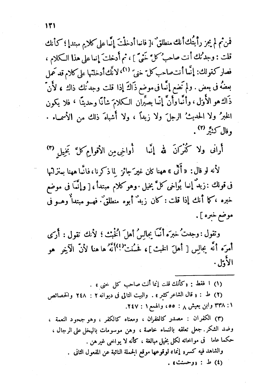 فمن ثم لم يجز لأنك لو قلت وجدتك أنك صاحب كل خنى رأيتك أنك منطلقٌ، فإنما أدخلت إنَّما على كلامٍ مبتدإ؛ كأنك قلت: وجدتك أنت صاحب كلِّ خىً، ثم أدخلت إنما على هذا الكلام، فصار كقولك: إنَّما أنت صاحب كل خنىً، لأنَّك أدخلتها على كلام قد عمل بعضه في بعض. ولم تضع إنَّما في موضع ذاك إذا قلت وجدتك ذاك، لأن ذاك هو الأول، وأنَّما وأنَّ إنما يصيِّران الكلام شأناً وحديثاً، فلا يكون الخبر ولا الحديث الرجل ولا زيداً، ولا أشباه ذلك من الأسماء. وقال كثيَّر.