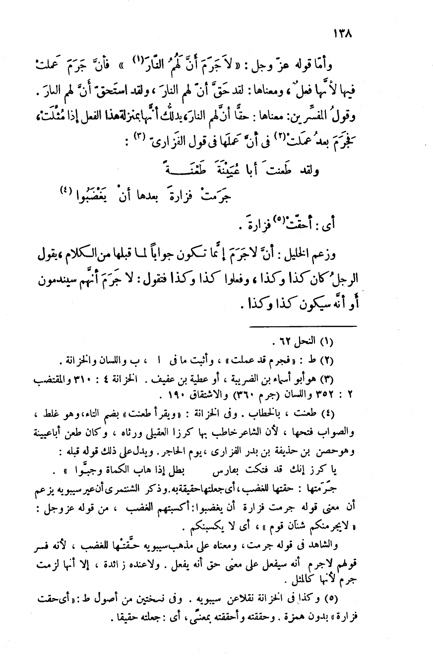 وأما قوله عز وجل: " لا جرم أنَّ لهم النار " فأنَّ جرم عملت فيها لأنَّها فعلٌ، ومعناها: لقد حقَّ أن لهم النار. ولقد استحق أن لهم النار وقول المفسَّرين: معناها: حقاً أنَّ لهم النار، يدلُّك أنَّها بمنزلة هذا الفعل إذا مثَّلت، فجرم بعد عملت في أنَّ عملها في قول الفزاري: