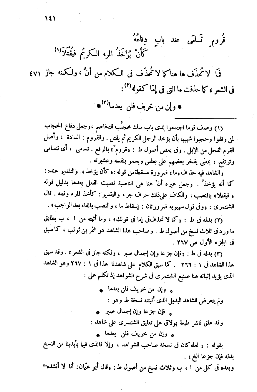 قرومٍ تَسامَى عند بابٍ دفِاعُهُ ... كَأنْ يُؤْخّذُ المرء الكريم فيقتلا