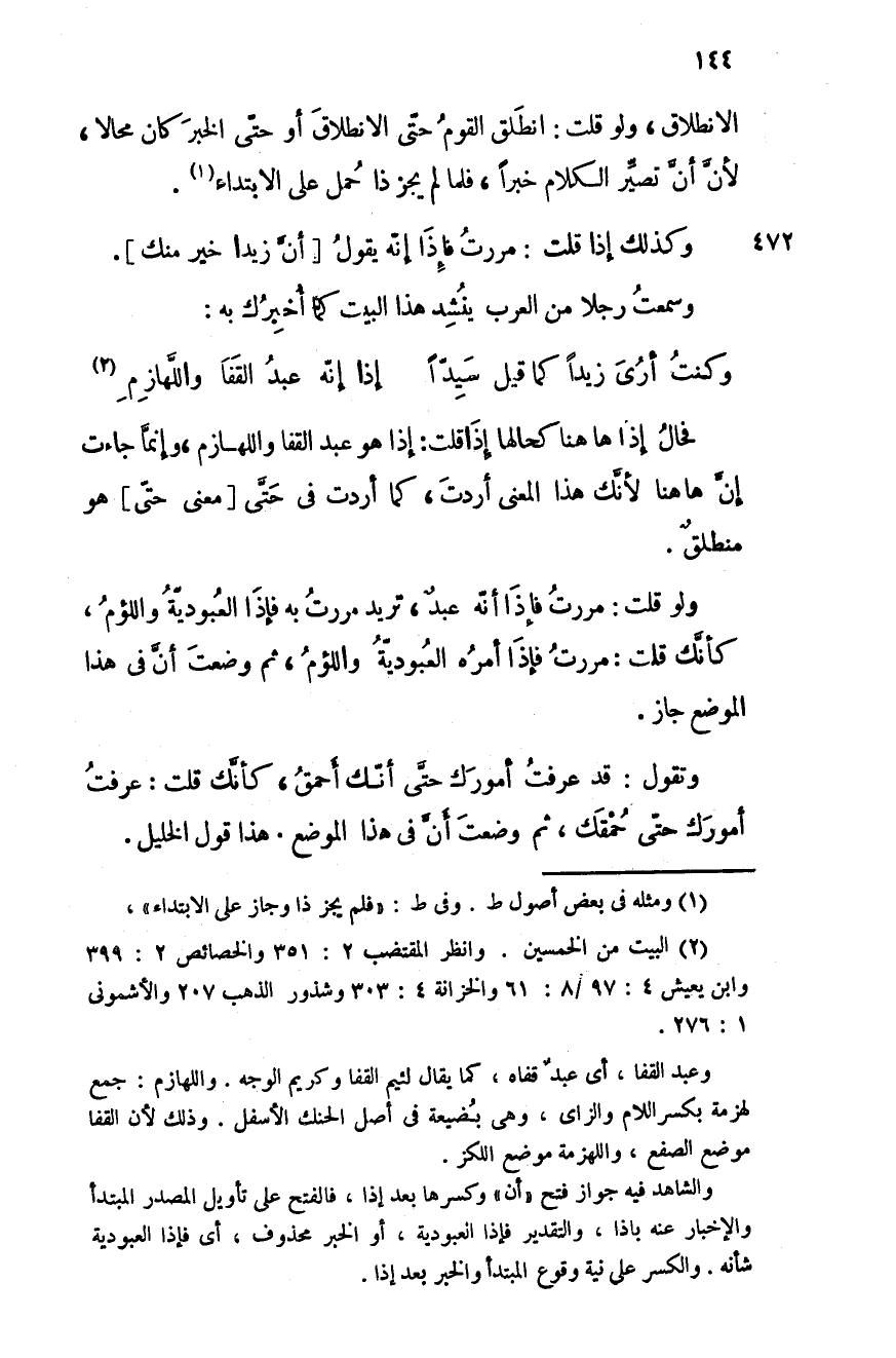 فحال إذا هاهنا كما لهل إذا قلت: إذا هو عبد القفا واللازم وإنما جاءت إن ها هنا لأنَّك هذا المعنى أردت، كما أردت في حتَّى معنى حتى هو منطلقٌ.