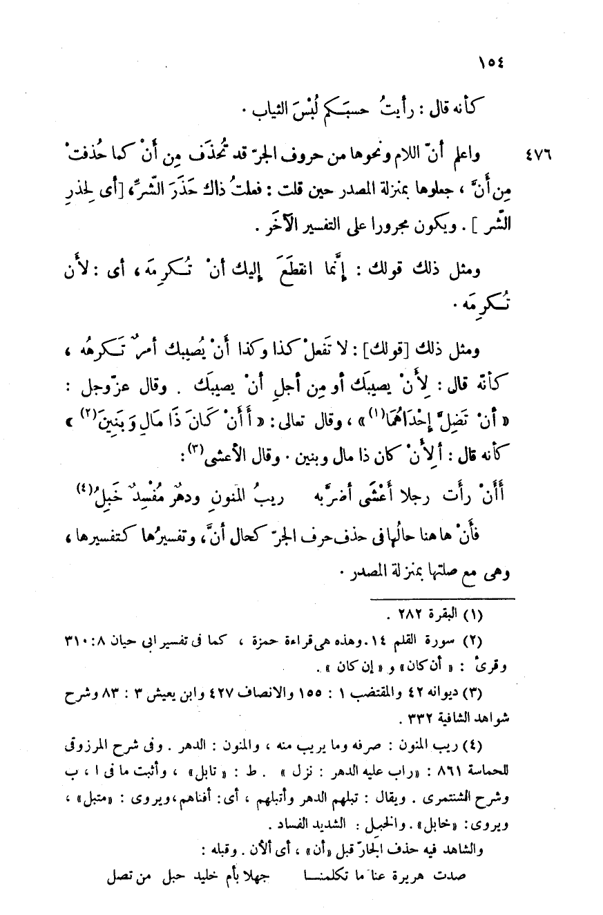 ومثل ذلك قولك: لا تفعل كذا وكذا أن يصيبك أمر تكرهه، كأنه قال: لأن يصيبك أو من أجل أن يصيبك. وقال عز وجل: " أن تضلَّ إحداهما "، وقال تعالى: " أأن كان ذا مالٍ وبنين " كأنه قال: ألأن كان ذا مال وبنين. وقال الأعشى: