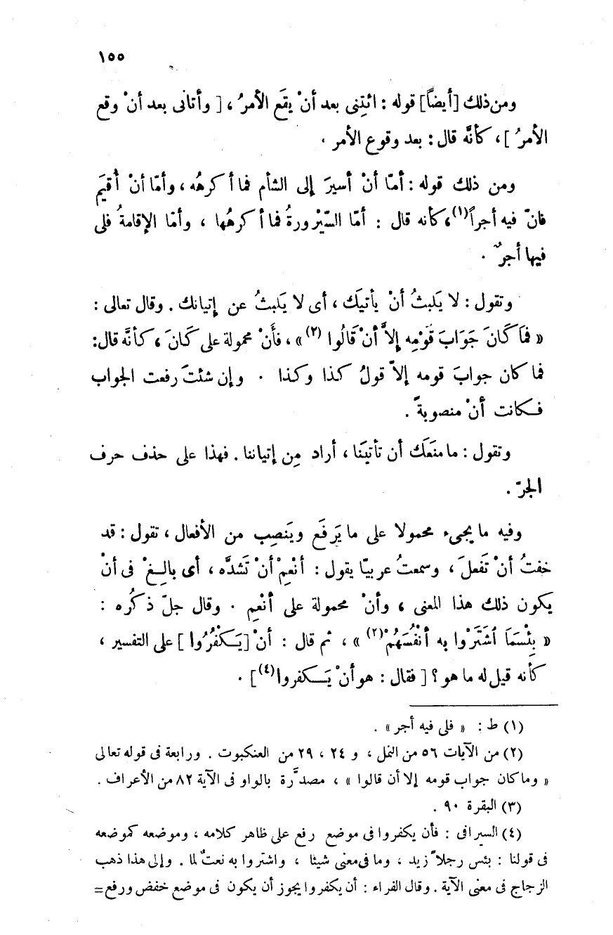 وفيه ما يجيء محمولاً على ما يرفع وينصب من الأفعال، تقول: قد خفت أن تفعل، وسمعت عربياً يقول: أنعم أن تشدَّه، أي بالغ في أن يكون ذلك هذا المعنى، وأن محمولة على أنعم. وقال جل ذكره: " بئسما اشتروا به أنفسهم "، ثم قال: أن يكفروا على التفسير، كأنه قيل له ما هو؟ فقال: هو أن يكفروا.