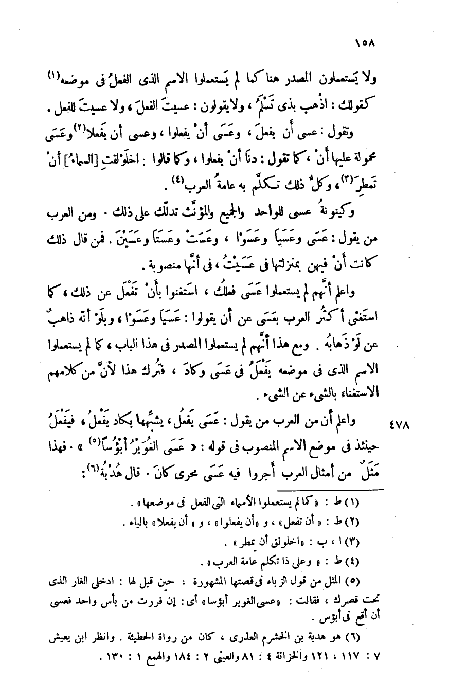 واعلم أنَّهم لم يستعملوا عسى فعلك، استغنوا بأن تفعل عن ذلك، كما استغنى أكثر العرب بعسى عن أن يقولوا: عسيا وعسوا، وبلو أنه ذاهبٌ عن لو ذهابه. ومع هذا أنَّهم لم يستعملوا المصدر في هذا الباب، كما لم يستعملوا الاسم الذي في موضعه يفعل في عسى وكاد، فترك هذا لأنَّ من كلامهم الاستغناء بالشيء عن الشيء.