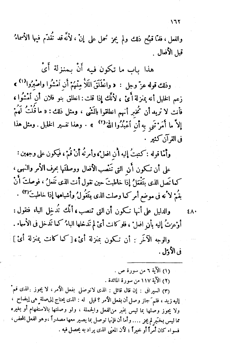 وذلك قوله عز وجل: " وانطلق الملأ منهم أن امشوا واصبروا " زعم الخليل أنه بمنزلة أي، لأنك إذا قلت: انطلق بنو فلان أن امشوا، فأنت لا تريد أن تخبر أنهم انطلقوا بالمشي، ومثل ذلك: ما قلت لهم إلاَّ ما أمرتني به أن اعبدوا الله. وهذا تفسير الخليل. ومثل هذا في القرآن كثير.
