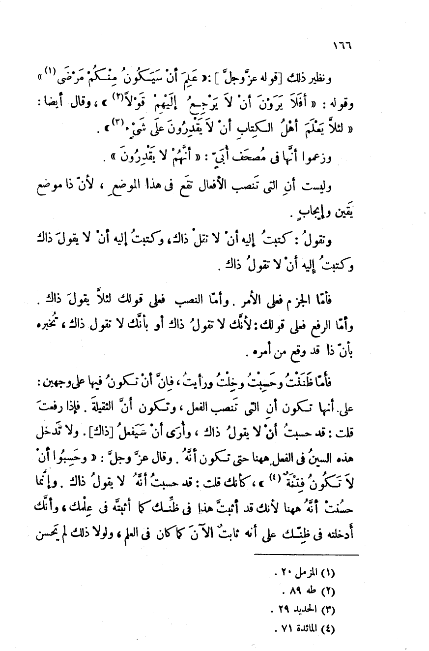 ونظير ذلك قوله عزَّ وجلَّ: " علم أن سيكون منكم مرضى " وقوله: " أفلا يرون أن لا يرجع إليهم قولاً "، وقال أيضاً: " لئلاَّ يعلم أهل الكتاب أن لا يقدرون على شيء ".