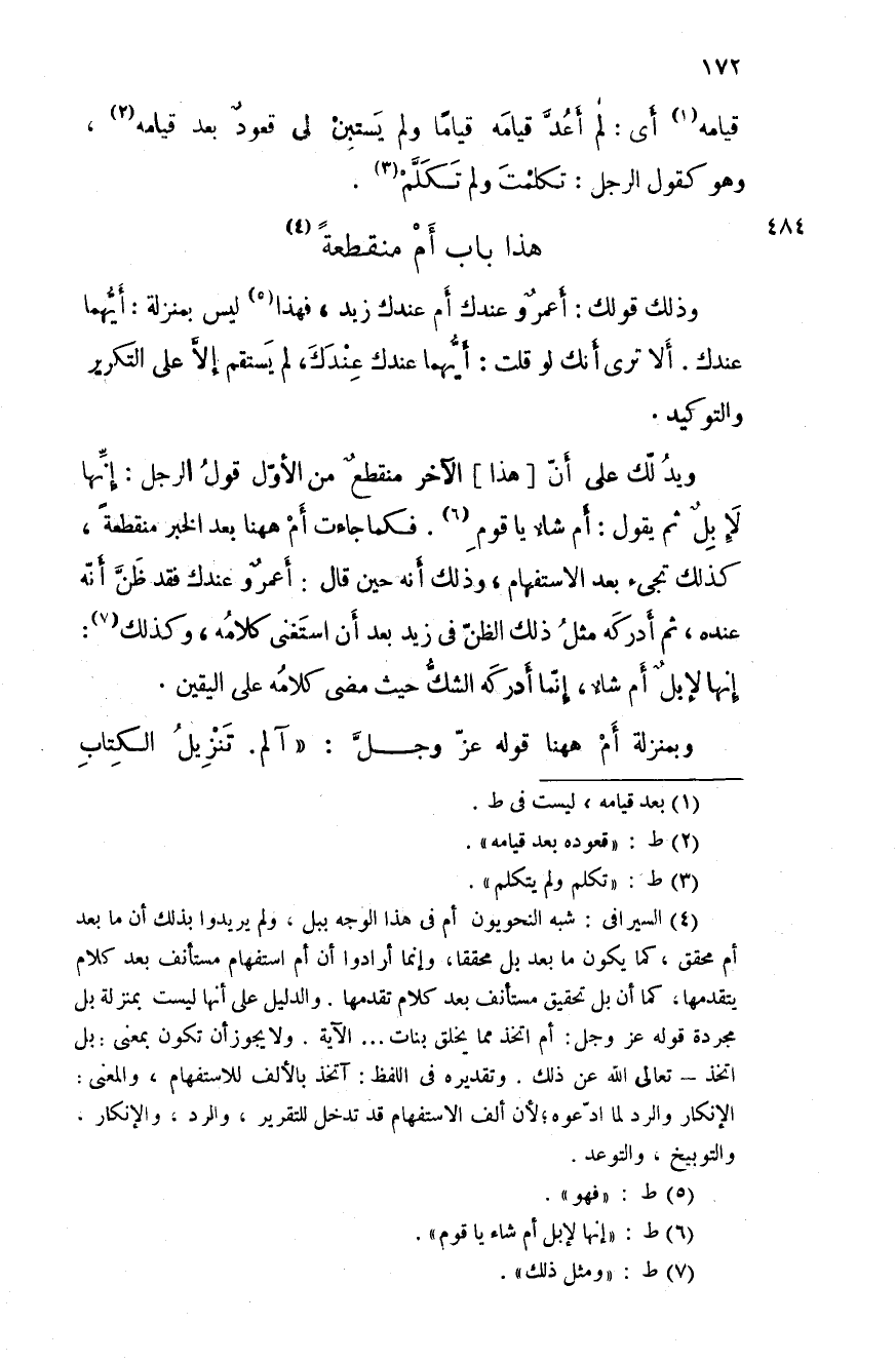 ويدلك على أن هذا الآخر منقطعٌ من الأول قول الرجل: إنِّها لإبلٌ ثم يقول: أم شاءٌ يا قوم. فكما جاءت أم ههنا بعد الخبر منقطعةً، كذلك تجيء بعد الاستفهام، وذلك أنه حين قال: أعمروٌ عندك فقد ظنَّ أنَّه عنده، ثم أدركه مثل ذلك الظن في زيد بعد أن استغنى كلامه، وكذلك: إنها لإبلٌ أم شاءٌ، إنما أدركه الشك حيث مضى كلامه على اليقين.