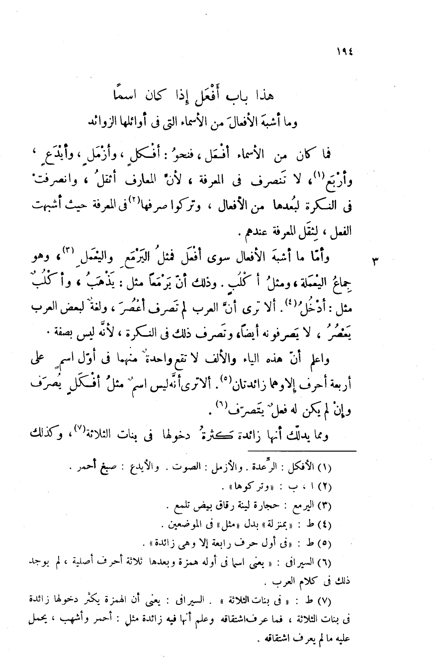 هذا باب أفعل إذا كان اسماً وما أشبه الأفعال من الأسماء التي في أوائلها الزوائد فما كان من الأسماء أفعل، فنحو: أفكلٍ، وأزملٍ، وأيدعٍ، وأربعٍ، لا تنصرف في المعرفة، لأنَّ المعارف أثقل، وانصرفت في النكرة لبعدها من الأفعال، وتركوا صرفها في المعرفة حيث أشبهت الفعل، لثقل المعرفة عندهم.