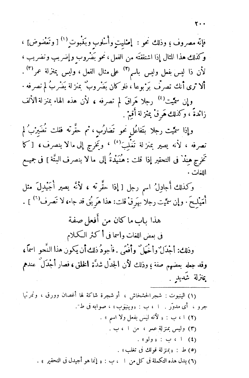 فإنّه مصروف؛ وذلك نحو: إصليتٍ وأسلوبٍ وينبوبٍ وتعضوض، وكذلك هذا المثال إذا اشتققته من الفعل، نحو يضروبٍ وإضريب وتضريب، لأن ذا ليس بفعل وليس باسم على مثال الفعل، وليس بمنزلة عمر. ألا ترى أنك تصرف يربوعا، فلو كان يضروبٌ بمنزلة يضرب لم تصرفه.