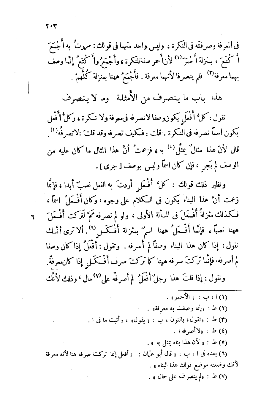 ؟؟ باب ما ينصرف من الأمثلة وما لا ينصرف تقول: كل أفعلٍ يكون وصفا لا تصرفه في معرفة ولا نكرة، وكل أفعل يكون اسماً تصرفه في النكرة. قلت: فكيف تصرفه وقد قلت: لا تصرفه. قال لأن هذا مثالٌ يمثلَّ به، فزعمت أنَّ هذا المثال ما كان عليه من الوصف لم يجر، فإن كان اسماً وليس بوصف جرى.