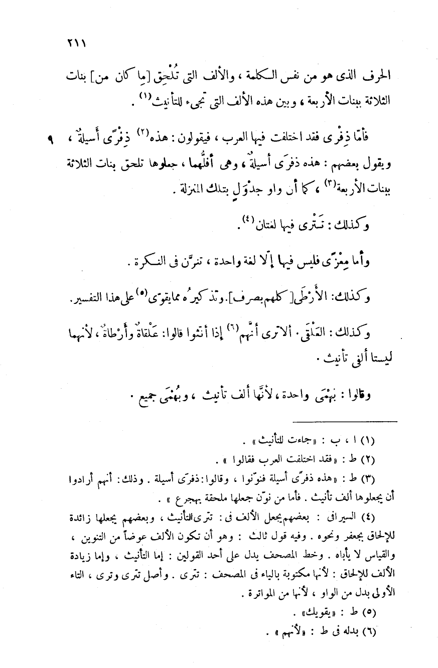 فأما ذفرى فقد اختلفت فيها العرب، فيقولون: هذه ذفرى أسيلةٌ، ويقول بعضهم: هذه ذفرى أسيلةٌ، وهي أفلّهما، جعلوها تلحق بنات الثلاثة ببنات الأربعة، كما أن واو جدولٍ بتلك المنزلة.