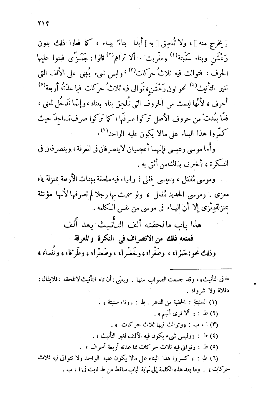 ما لحقته ألف التأنيث بعد ألف فمنعه ذلك من الانصراف في النكرة والمعرفة وذلك نحو حمراء، وصفراء، وخضراء، وصحراء، وطرفاء، ونفساء،