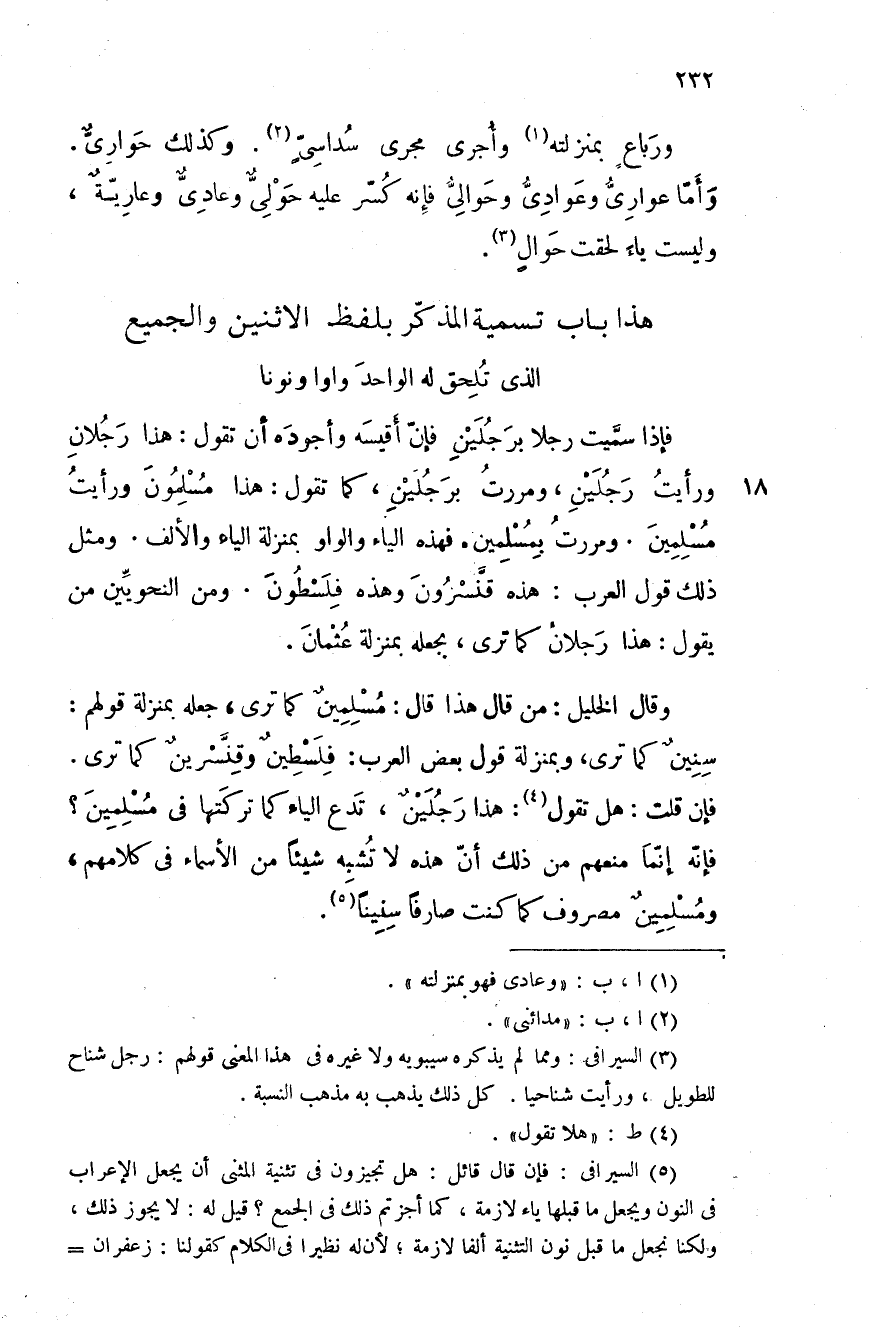 فإذا سميَّت رجلاً برجلين فإن أقيسه وأجوده أن تقول: هذا رجلان ورأيت رجلين، ومررت برجلين، كما تقول: هذا مسلمون ورأيت مسلمين. ومررت بمسلمين. فهذه الياء والواو بمنزلة الياء والألف. ومثل ذلك قول العرب: هذه قنَّسرون وهذه فلسطون. ومن النحويين من يقول: هذا رجلان كما ترى، يجعله بمنزلة عثمان.