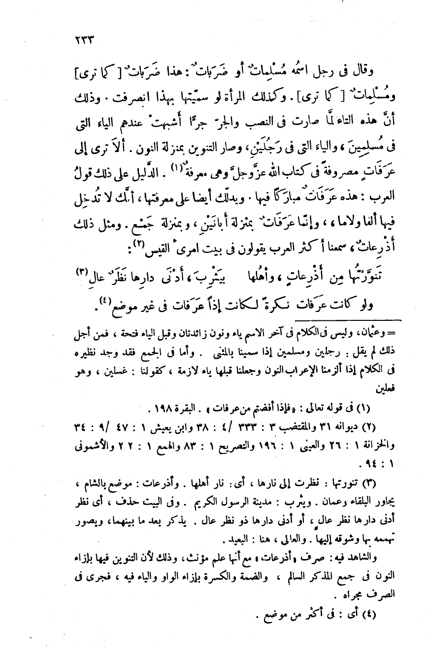 وقال في رجل اسمه مسلماتٌ أو ضرباتٌ: هذا ضرباتٌ كما ترى ومسلماتٌ كما ترى. وكذلك المرأة لو سميتها بهذا انصرفت. وذلك أن هذه التاء لما صارت في النصب والجر جراً أشبهت عندهم الياء التي في مسلمين، والياء التي في رجلين، وصار التنوين بمنزلة النون. ألا ترى إلى عرفاتٍ مصروفةً في كتاب الله عز وجلَّ وهي معرفةٌ. الدَّليل على ذلك قول العرب: هذه عرفاتٌ مباركاً فيها. ويدلك أيضاً على معرفتها أنك لا تدخل فيها ألفاً ولاما، وإنما عرفاتٌ بمنزلة أبانين، وبمنزلة جمع. ومثل ذلك أذرعاتٌ، سمعنا أكثر العرب يقولون في بيت امرئ القيس: