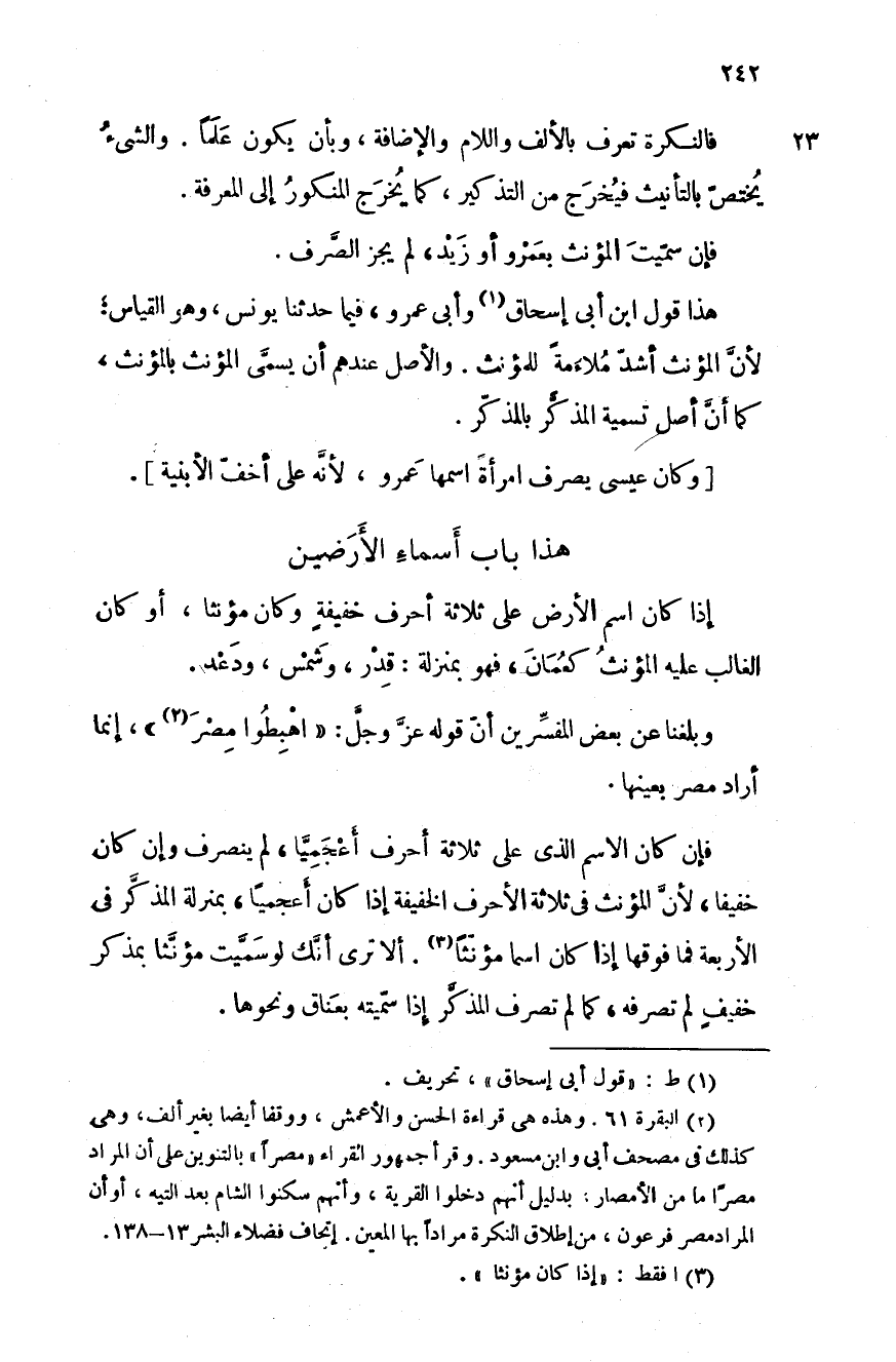 هذا باب أسماء الأرضين إذا كان اسم الأرض على ثلاثة أحرف خفيفةٍ وكان مؤنثاً، أو كان الغالب عليه المؤنث كعمان، فهو بمنزلة: قدر، وشمس، ودعد.