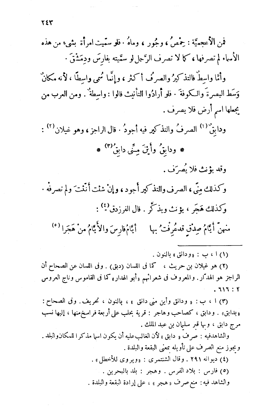 فمن الأعجمَّية: حمص، وجور، وماه. فلو سميت امرأة بشىء من هذه الأسماء لم تصرفها، كما لا تصرف الرَّجل لو سميَّته بفارس ودمشق.