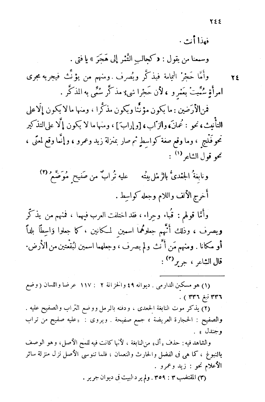 فمن الأرضين: ما يكون مؤنَّثا ويكون مذكَّرا، ومنها مالا يكون إلا على التأنيث، نحو: عمان، والزاب، وإراب، ومنها ما لا يكون إَّلا على التذكير نحو فلجٍ، وما وقع صفة كواسطٍ ثم صار بمنزلة زيد وعمرو، وإنمَّا وقع لمعنى، نحو قول الشاعر: