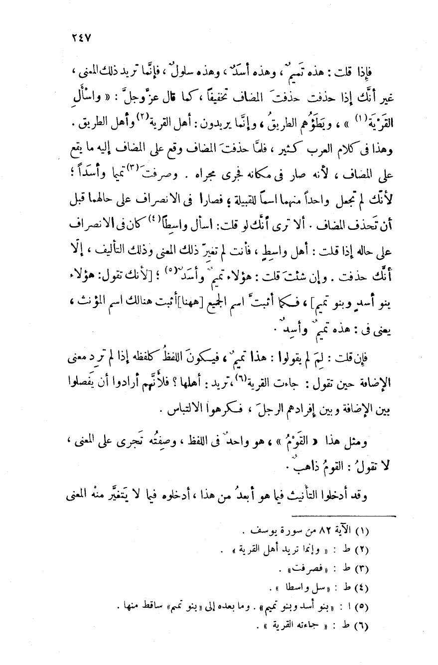 فإذا قلت: هذه تميمٌ، وهذه أسدٌ، وهذه سلولٌ، فإنَّما تريد ذلك المعنى، غير أنَّك إذا حذفت المضاف تخفيفاً، كما قال عزَّ وجلَّ: " واسأل القرية "، ويطؤهم الطريق، وأنَّما يريدون: أهل القرية وأهل الطريق. وهذا في كلام العرب كثير، فلمَّا حذفت المضاف وقع عل المضاف إليه ما يقع على المضاف، لأنه صار في مكانه فجرى مجراه. وصرفت تميماً وأسداً؛ لأنك لم تجعل واحداً منهما اسماً للقبيلة؛ فصارا في الانصراف على حالهما قبل أن تحذف المضاف. ألا ترى أنَّك لو قلت: اسأل واسطاً كان في الانصراف على حاله إذا قلت: أهل واسطٍ فأنت لم تغير ذلك المعنى وذلك التأليف، إلا أنَّك حذفت. وإن شئت قلت: هؤلاء تميمٌ وأسدٌ؛ لأنَّك تقول: هؤلاء بنو أسدٍ وبنو تميم، فكما أثبتَّ اسم الجميع ههنا أثبت هنالك اسم المؤنث، يعني في: هذه تميمٌ وأسدٌ.