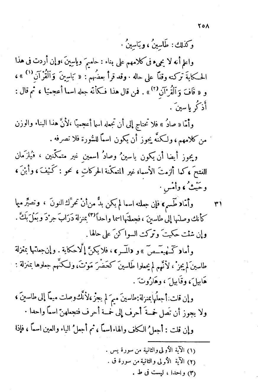 واعلم أنه لا يجيء في كلامهم على بناء: حاميم وياسين، وإن أردت في هذا الحكاية تركته وقفاً على حاله. وقد قرأ بعضهم: " ياسين والقرآن "، و " قاف والقرآن ". فمن قال هذا فكأنه جعله اسما أعجميا، ثم قال: أذكر ياسين.