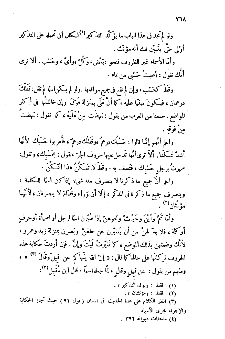 ولو لم تجد في هذا الباب ما يؤكد التذكير لكان أن تحمله على التذكير أولى حتىَّ يتبين لك أنه مؤنث.