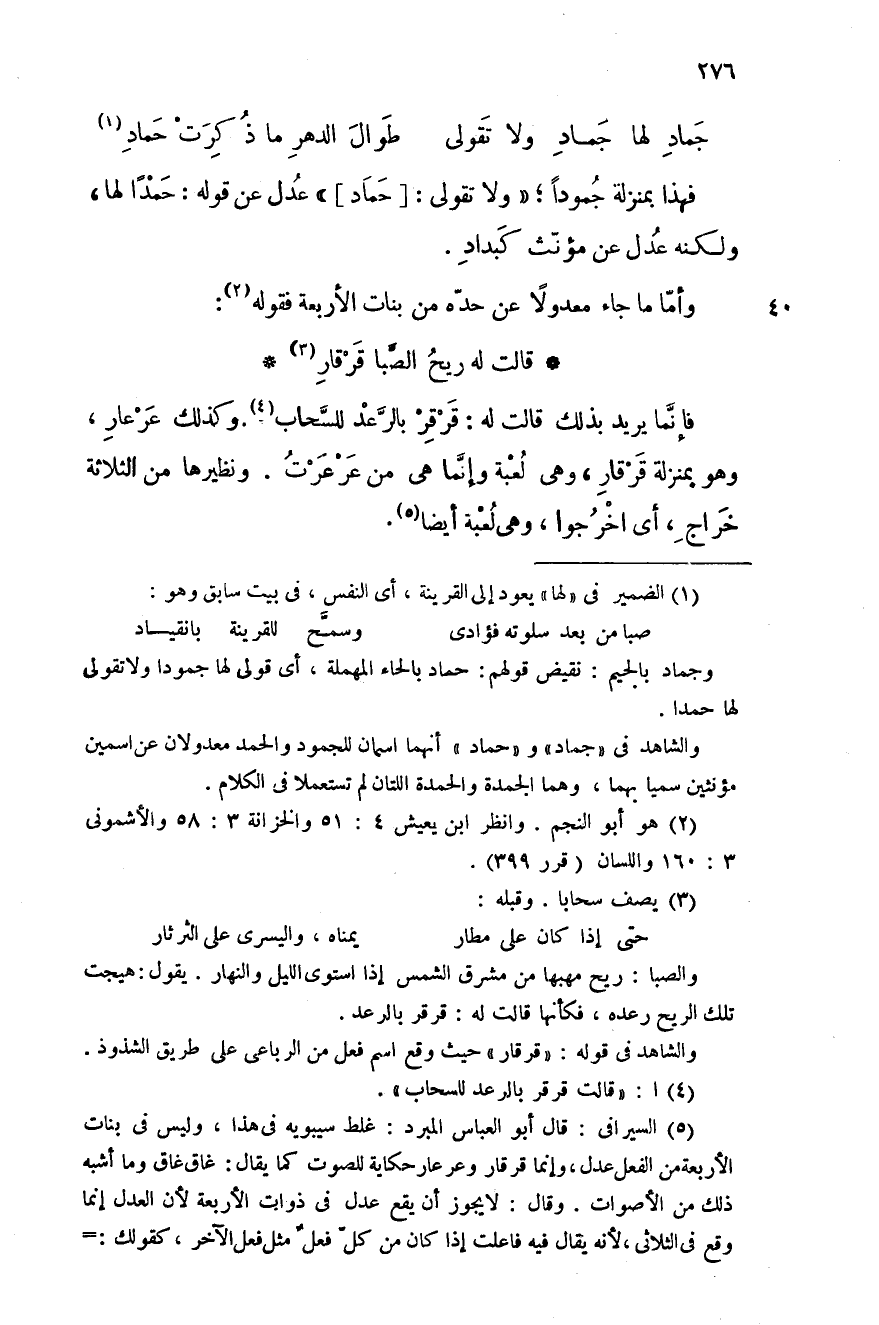 فإنَّما يريد بذلك قال له: قرقر بالرَّعد للسَّحاب، وكذلك عرعار، وهو بمنزلة قرقار، وهي لعبة وإنمَّا هي من عرعرت. ونظيرها من الثلاثة خراج، أي اخرجوا، وهب لعبة أيضاً.