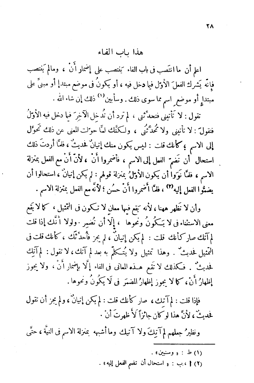 اعلم أن ما انتصب في باب الفاء ينتصب على إضمار أن، وما لم ينتصب فإنه يشرك الفعل الأول فيما دخل فيه، أو يكون في موضع مبتدإ أو مبني على مبتدإ أو موضع اسم مما سوى ذلك. وسأبين ذلك إن شاء الله.