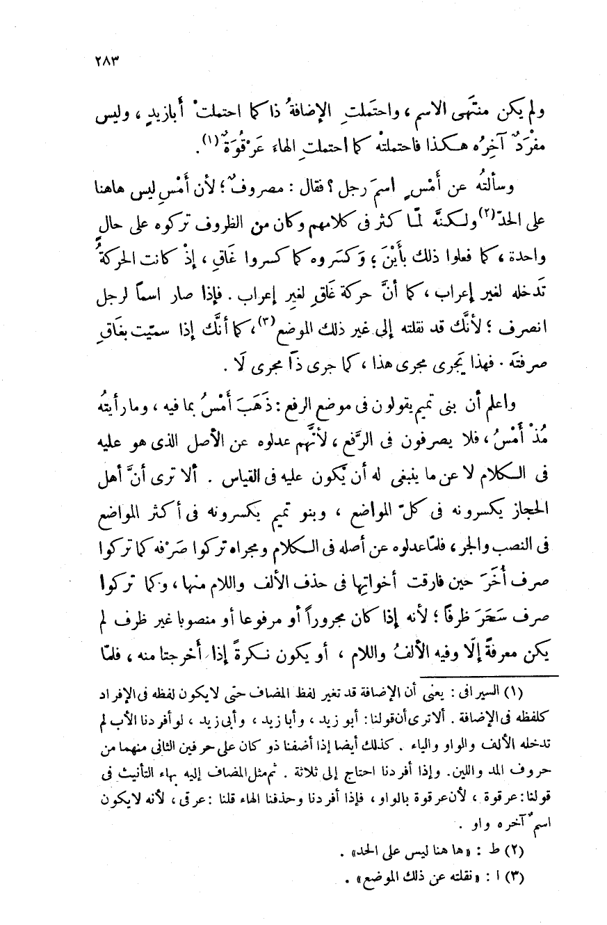 واعلم أنَّ بني تميم يقولون في موضع الرفع: ذهب أمس بما فيه، وما رأيته مذ أمس، فلا يصرفون في الرَّفع، لأنهم عدلوه عن الأصل الذي هو عليه في الكلام لا عن ما ينبغي له أن يكون عليه في القياس. ألا ترى أنَّ أهل الحجاز يكسرونه في كلّ المواضع، وبنو تميم يكسرونه في أكثر المواضع في النصب والجر، فلما عدلوه عن أصله في الكلام ومجراه تركوا صرفه كما تركوا صرف أخر حين فارقت أخواتها في حذف الألف واللام منها، وكما تركوا صرف سحر ظرفاً؛ لأنه إذا كان مجروراً أو مرفوعاً أو منصوباً غير ظرف لم يكن معرفةً إلا وفيه الألف واللام، أو يكون نكرةً إذا أخرجتا منه، فلمّا