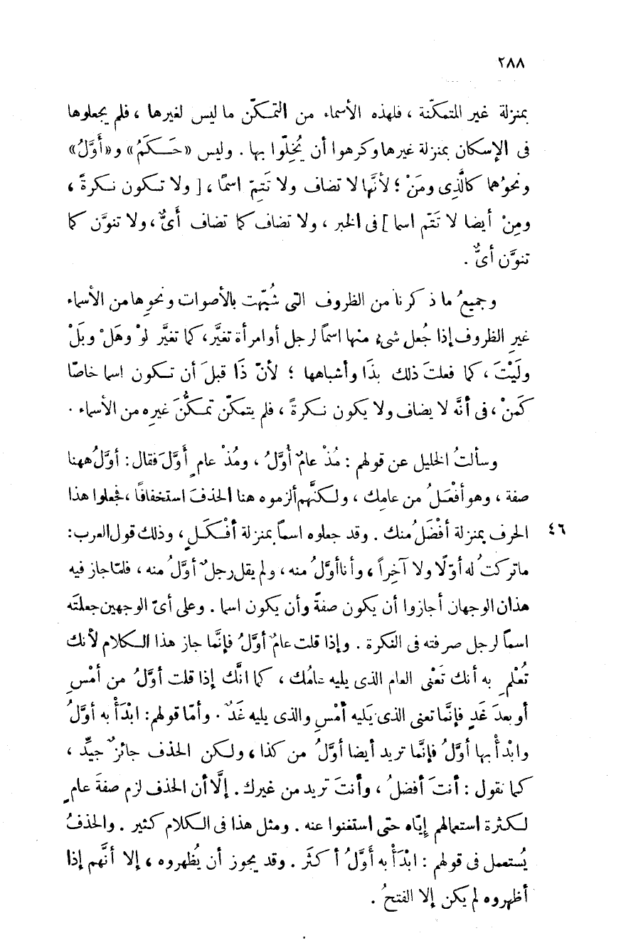وسألت الخليل عن قولهم: مذ عامٌ أوَّل، ومذ عامٍ أوَّل فقال: أوَّل ههنا صفة، وهو أفعل من عامك، ولكنَّهم ألزموه هنا الحذف استخفافاً، فجعلوا هذا الحرف بمنزلة أفضل منك. وقد جعلوه اسماً بمنزلة أفكّلٍ، وذلك قول العرب: ما تركت له أولاً ولا آخراً، وأنا أوَّل منه، ولم يقل رجلٌ أوَّل منه، فلمَّا جاز فيه هذان الوجهان أجازوا أم يكون صفة وأن يكون اسما. وعلى أي الوجهين جعلته اسماً لرجل صرفته اسماً في النكرة. وإذا قلت عامٌ أوَّل فإنما جاز هذا الكلام لأنك تعلم به أنك تعني العام الذي يليه عامك، كما أنَّك إذا قلت أوَّل من أمس أو بعد غدٍ فإنمَّا تعني الذي يليه أمس والذي يليه غدٌ. وأما قولهم: ابدأ به أوَّل وابدأ بها أوَّل فإنمَّا تريد أيضاً أوَّل من كذا، ولكن الحذف جائز جيدِّ، كما تقول: أنت أفضل، وأنت تريد من غيرك. إلاَّ أن الحذف لزم صفة عامٍ لكثرة استعمالهم إياه حتى استغنوا عنه. ومثل هذا في الكلام كثير. والحذف يستعمل في قولهم: ابدأ به أوَّل أكثر. وقد يجوز أن يظهروه، إلا أنهَّم إذا أظهروه لم يكن إلا الفتح.