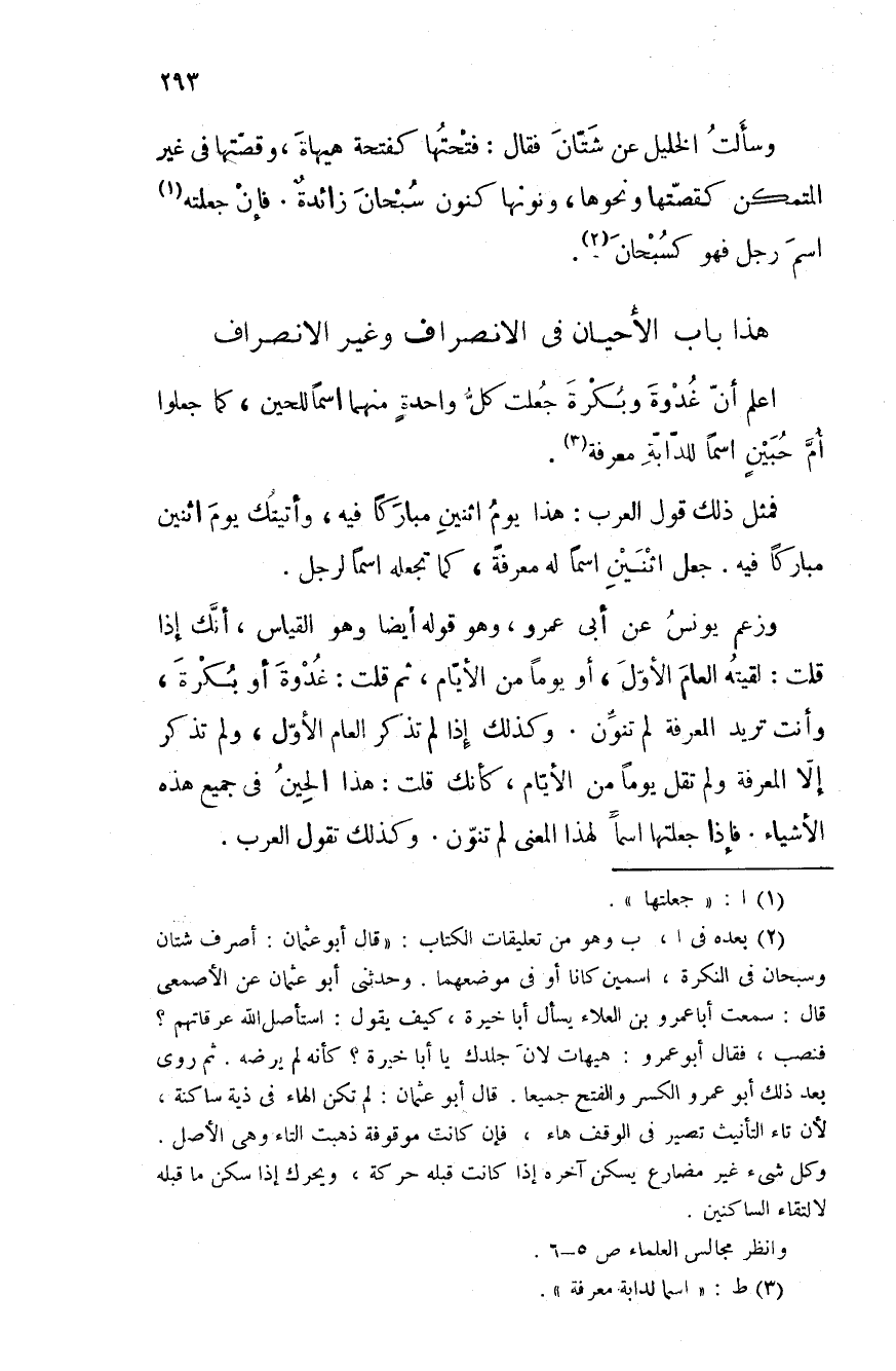 باب الأحيان في الانصراف وغير الانصراف اعلم أن غدوة وبكرة جعلت كلَّ واحدةٍ منهما اسماً للحين، كما جعلوا أمَّ حبينٍ اسماً للدابة معرفة.