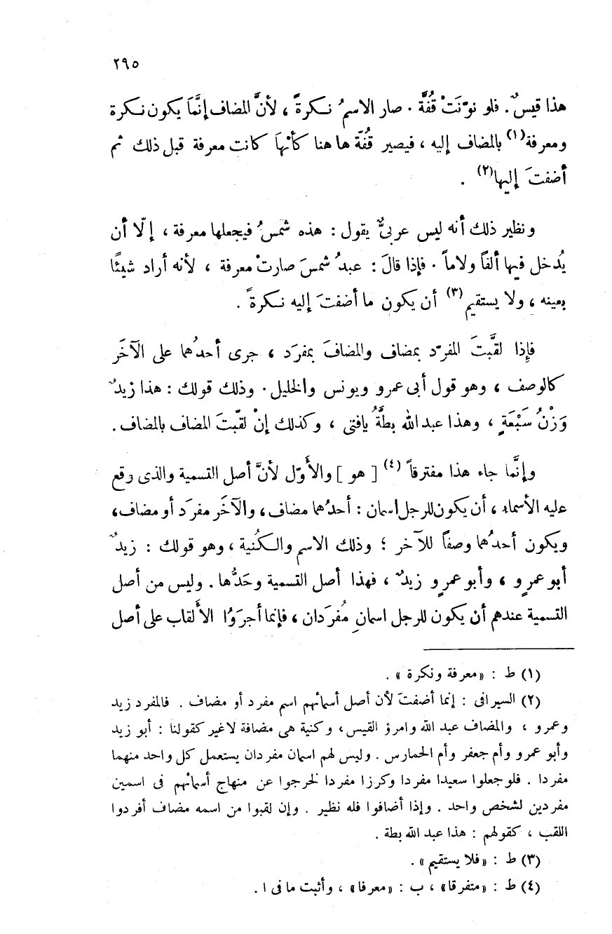 ونظير ذلك انه ليس عربيٌّ يقول: هذه شمس فيجعلها معرفة، إلا أن يدخل فيها ألفاً ولاماً. فإذا قال: عبد شمس صارت معرفة، لأنه أراد شيئاً بعينه، ولا يستقيم أن يكون ما أضفت إليه نكرةً.