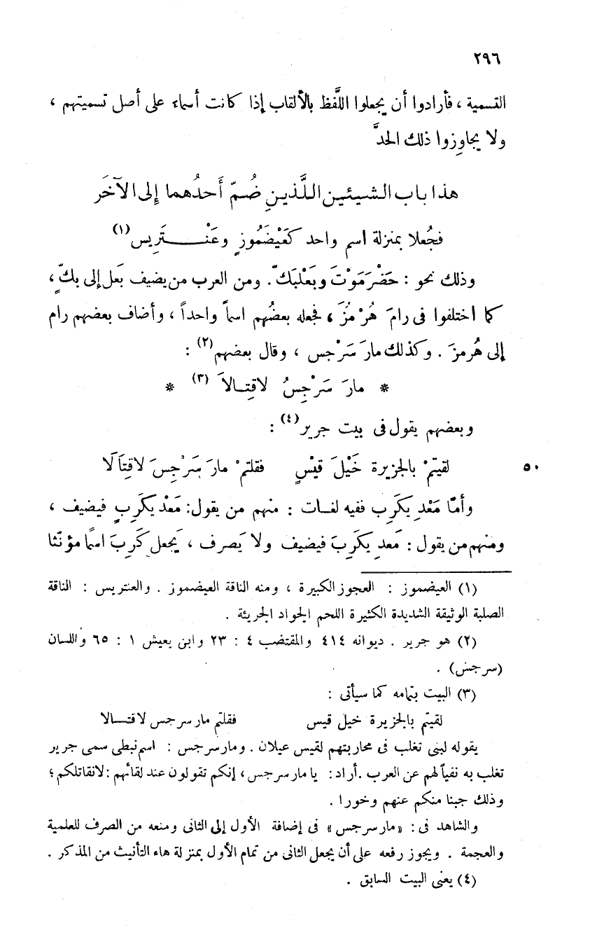باب الشيئين الَّلذين ضم أحدهما إلى الآخر فجعلا بمنزلة اسم واحد كعيضموزٍ وعنتريس وذلك نحو: حضرموت وبعلبك. ومن العرب من يضيف بعل إلى بكٍّ، كما اختلفوا في رام هرمز، فجعله بعضهم اسماً واحداً، وأضاف بعضهم رام إلى هرمز. وكذلك مار سرجس، وقال بعضهم: