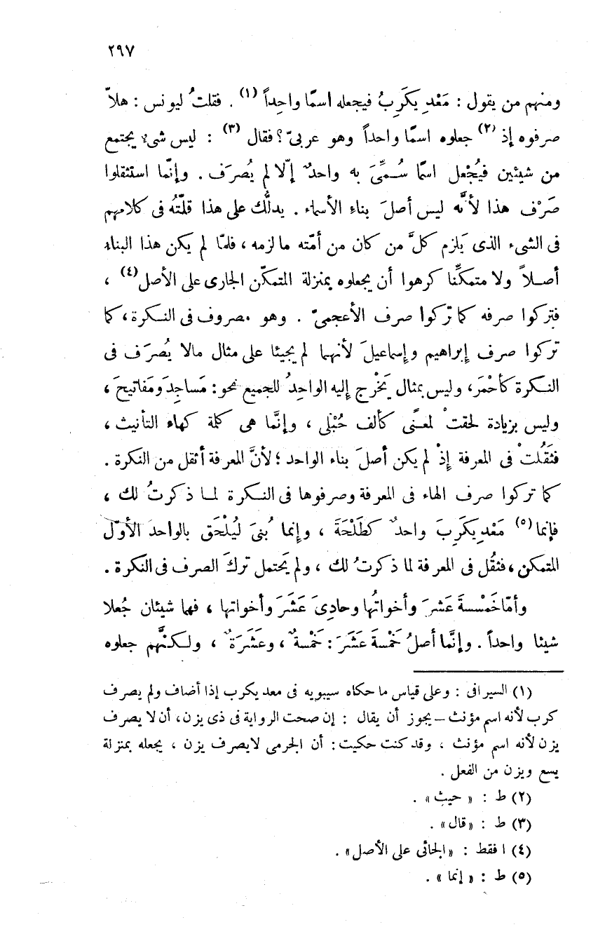 ومنهم من يقول: معد يكرب فيجعله اسماً واحداً فقلت ليونس: هلا صرفوه إذ جعلوه اسماً واحداً وهو عربي؟ فقال: ليس شيءٌ يجتمع من شيئين فيجعل اسماً سميِّ به واحدٌ إلا لم يصرف. وإنما استثقلوا صرف هذا لأنَّه ليس أصل بناء الأسماء. يدلك على هذا قلته في كلامهم في الشيء الذي يلزم كلَّ من كان من أمته ما لزمه، فلما لم يكن هذا البناء أصلاً ولا متمكنِّا كرهوا أن يجعلوه بمنزلة المتمكن الجاري على الأصل، فتركوا صرفه كما تركوا صرف الأعجمي. وهو مصروف في النكرة، كما تركوا صرف إبراهيم وإسماعيل لأنهما لم يجيئا على مثال ما لا يصرف في النكرة كأحمر، وليس بمثال يخرج إليه الواحد للجميع نحو: مساجد ومفاتيح، وليس بزيارة لحقت لمعنىً كألف حبلى، وإنمَّا هي كلمة كهاء التأنيث، فثقلت في المعرفة إذ لم يكن أصل بناء الواحد؛ لأنَّ المعرفة أثقل من النكرة. كما تركوا صرف الهاء في المعرفة وصرفوها في النكرة لما ذكرت بك، فإنما معد يكرب واحدٌ كطلحة، وإنما بني ليلحق بالواحد الأول المتمكن، فثقل في المعرفة لما ذكرت بك، ولم يحتمل ترك الصرف في النكرة. وأما خمسة عشر وأخواتها وحادي عشر وأخواتها، فهما شيئان جعلا شيئاً واحداً. وإنمَّا أصل خمسة عشر: خمسةٌ، وعشرةٌ، ولكنهم جعلوه