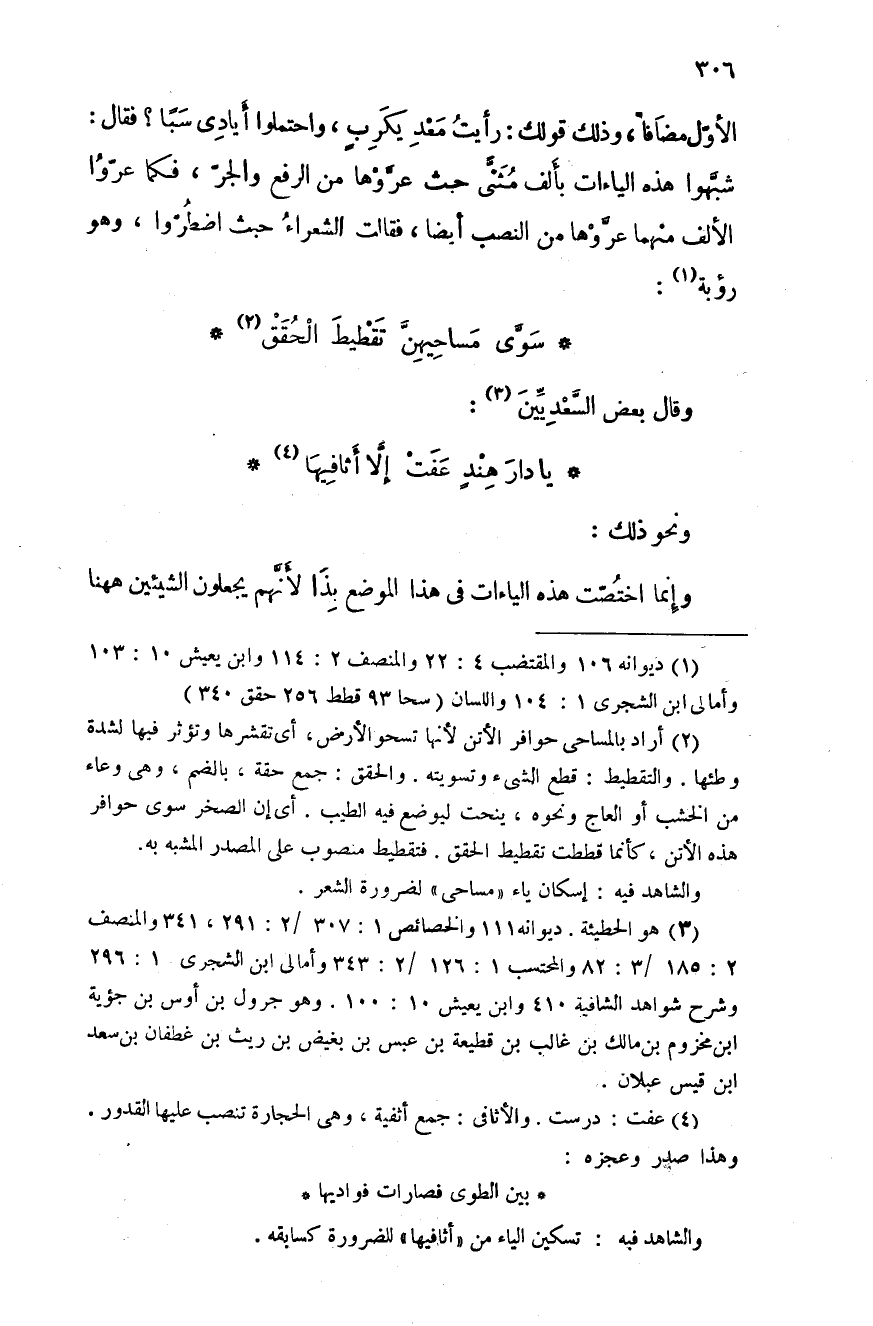 الأول مضافاً، وذلك قولك: رأيت معد يكرب، واحتملوا أيادي سباً؟ فقال: شبَّهوا هذه الياءات بألف مثنى حيث عرَّوها من الرفع والجر، فكما عروا الألف منهما عرَّوها من النصب أيضاً، فقالت الشعراء حيث اضطرّوا، وهو رؤية: