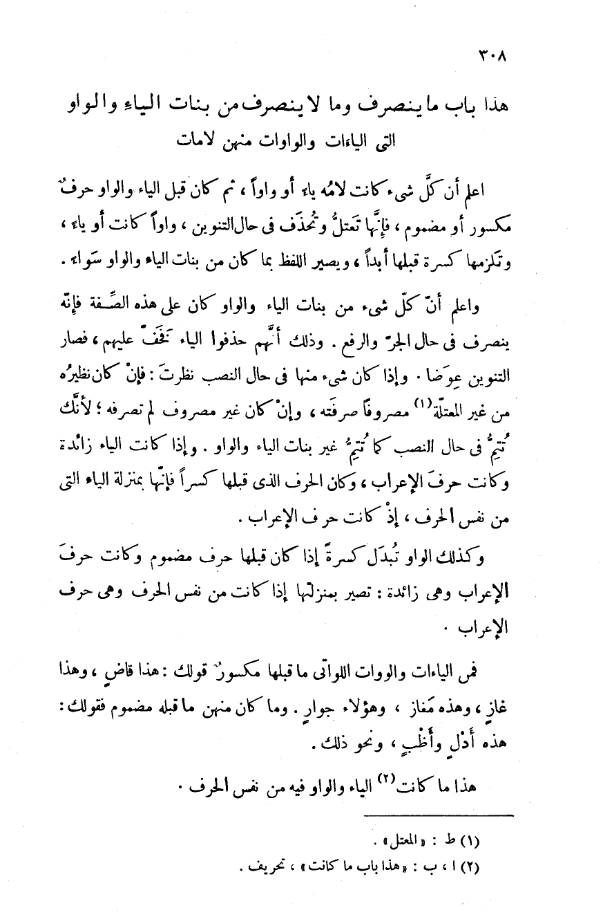 واعلم أن كل شيء من بنات الياء والواو كان على الصفة فإنه ينصرف في حال الجر والرفع. وذلَّك أنَّهم حذفوا الياء فخف عليهم، فصار التنوين عوضاً. وإذا كان شيء منها في حال النصب نظرت: فإن كان نظيره من غير المعتلة مصروفاً صرفته، وإن كان غير مصروف لم تصرفه؛ لأنَّك تتم في حال النصب كما تتم غير بنات الياء والواو. وإذا كانت الياء زائدة وكانت حرف الإعراب، وكان الحرف الذي قبلها كسراً فإنها بمنزلة الياء التي من نفس الحرف، إذ كانت حرف الإعراب.