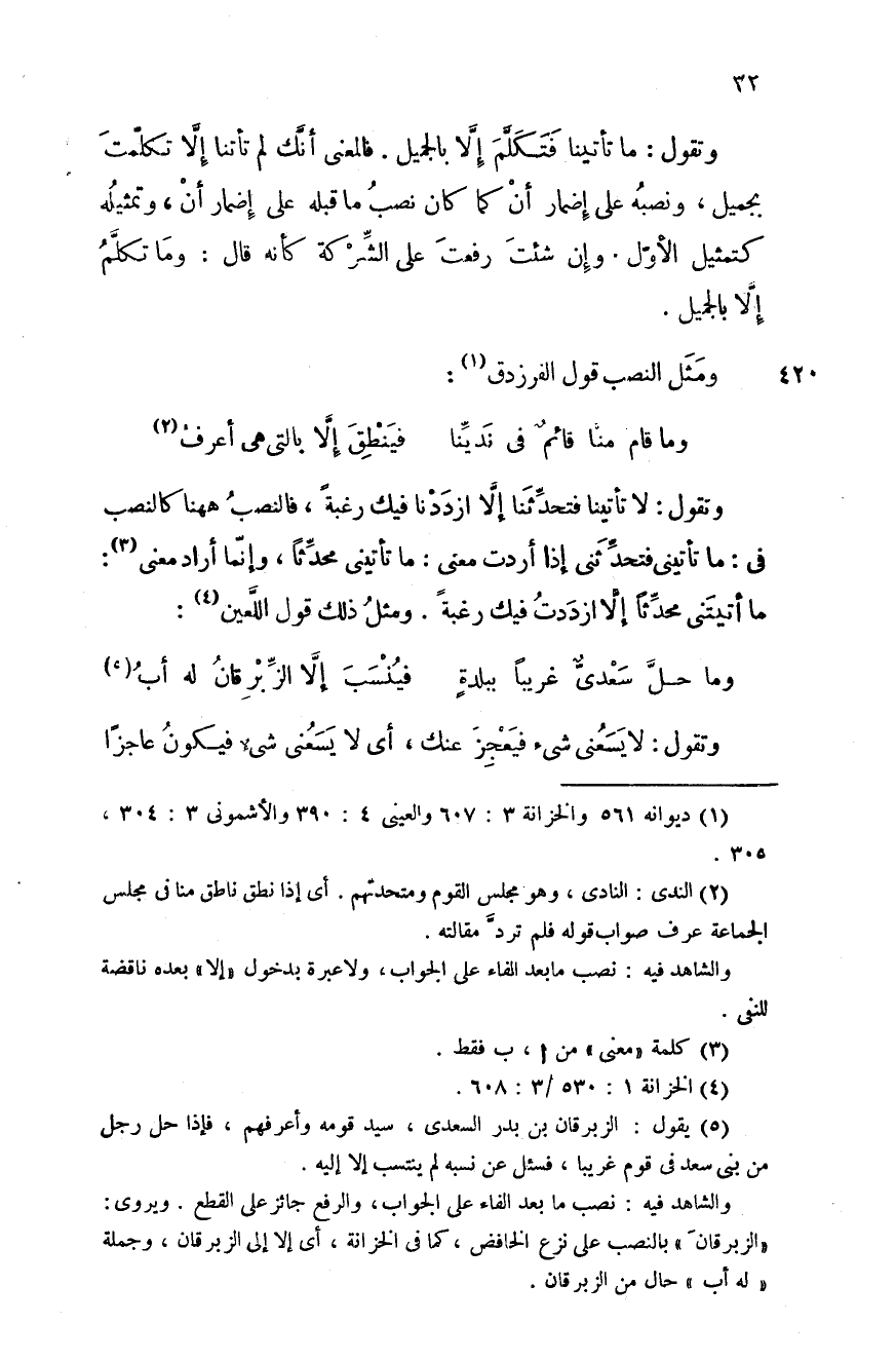 وتقول: ما تأتينا فتكلم إلا بالجميل. فالمعنى أنّك لم تأتنا إلا تكلمت بجميل، ونصبه على إضمار أن كما كان نصب ما قبله على إضمار أن، وتمثيله كتمثيل الأول وإن شئت رفعت على الشركة كأنه قال: وما تكلم إلاّ الجميل.
