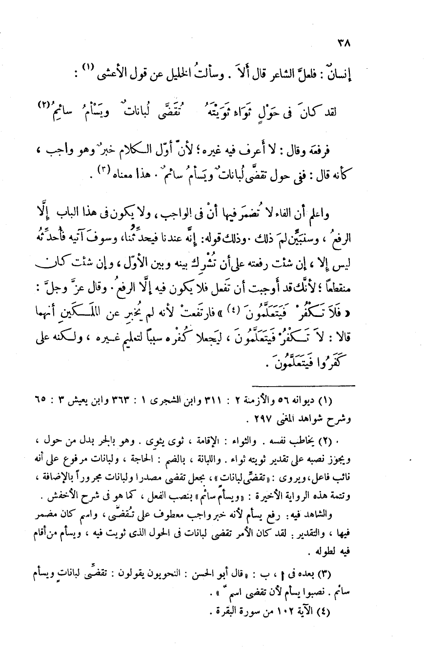 واعلم أن الفاء لا تضمر فيها أن في الواجب، ولا يكون في هذا الباب إلا الرفع، وسنبين لم ذلك. وذلك قوله: إنه عندنا فيحدثنا، وسوف آتيه فأحدثه ليس إلا، إن شئت رفعته على أن تشرك بينه وبين الأول، وإن شئت كان منقطعاً؛ لأنك قد أوجبت أن تفعل فلا يكون فيه إلا الرفع. وقال عز وجل: " فلا تكفر فيتعلمون " فارتفعت لأنه لم يخبر عن الملكين أنهما قالا: لا تكفر فيتعلمون، ليجعلا كفره سبباً لتعليم غيره، ولكنه على كفروا فيتعلّمون.