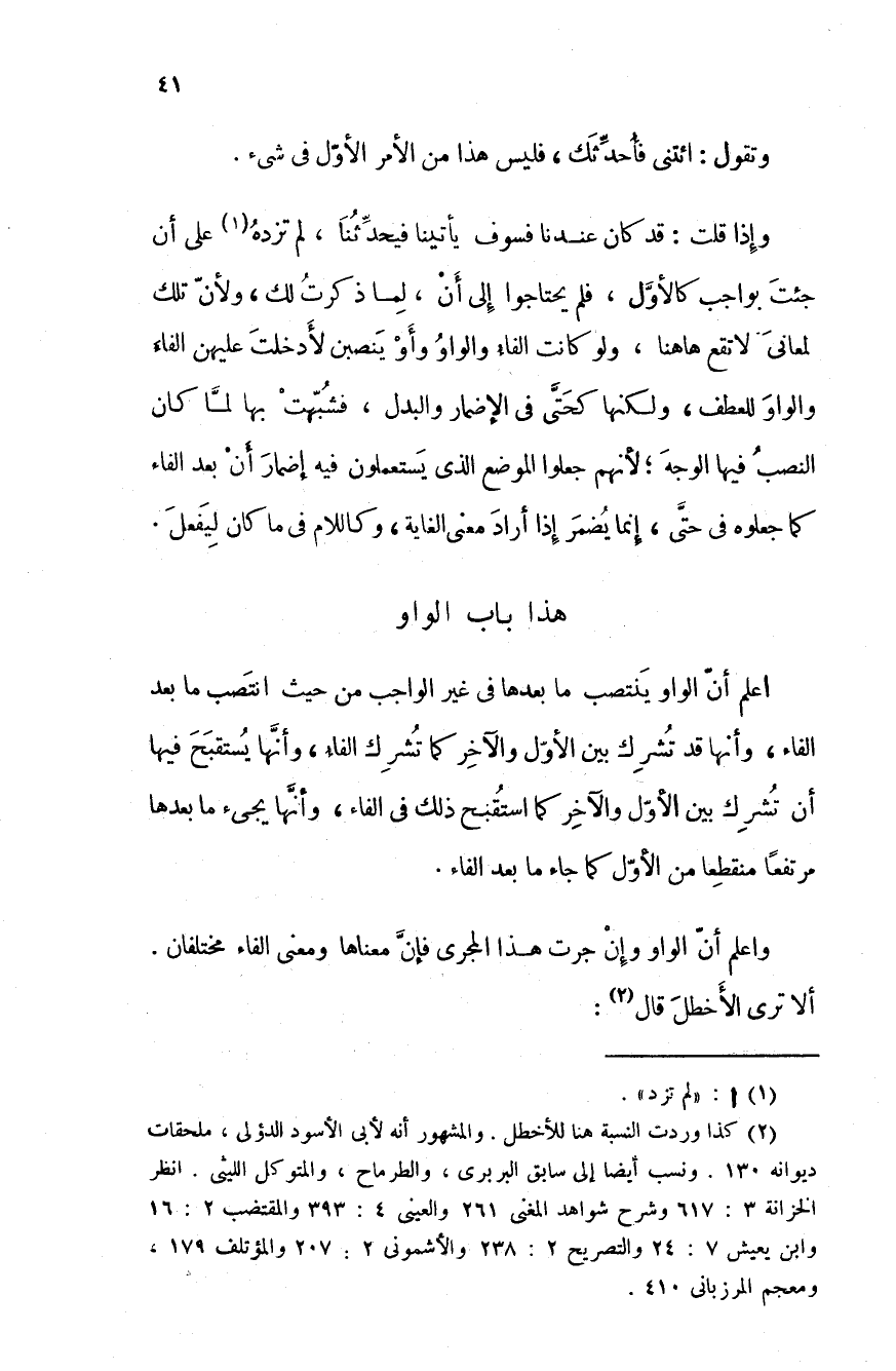 اعلم أن الواو ينتصب ما بعدها في غير الواجب من حيث انتصب ما بعد الفاء، وأنها قد تشرك بين الأول والآخر كما تشرك الفاء، وأنها يستقبح فيها أن تشرك بين الأول والآخر كما استقبح ذلك في الفاء، وأنها يجئ ما بعدها مرتفعاً منقطعاً من الأول كما جاء ما بعد الفاء.