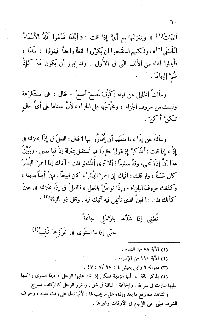 وسألته عن إذا، ما منعهم أن يجازوا بها؟ فقال: الفعل في إذا بمنزلته في إذ، إذا قلت: أتذكر إذ تقول، فإذا فيما تستقبل بمنزلة إذ فيما مضى. ويبيّن هذا أنّ إذا تجئ وقتاً معلوماً؛ ألا ترى أنك لو قلت: أتيك إذا احمر البسر كان حسناً، ولو قلت: آتيك إن احمر البسر، كان قبيحاً. فإن أبداً مبهمة، وكذلك حروف الجزاء. وإذا توصل بالفعل، فالفعل في إذا بمنزلته في حين كأنك قلت: الحين الذي تأتيني فيه آتيك فيه. وقال ذو الرمة:
