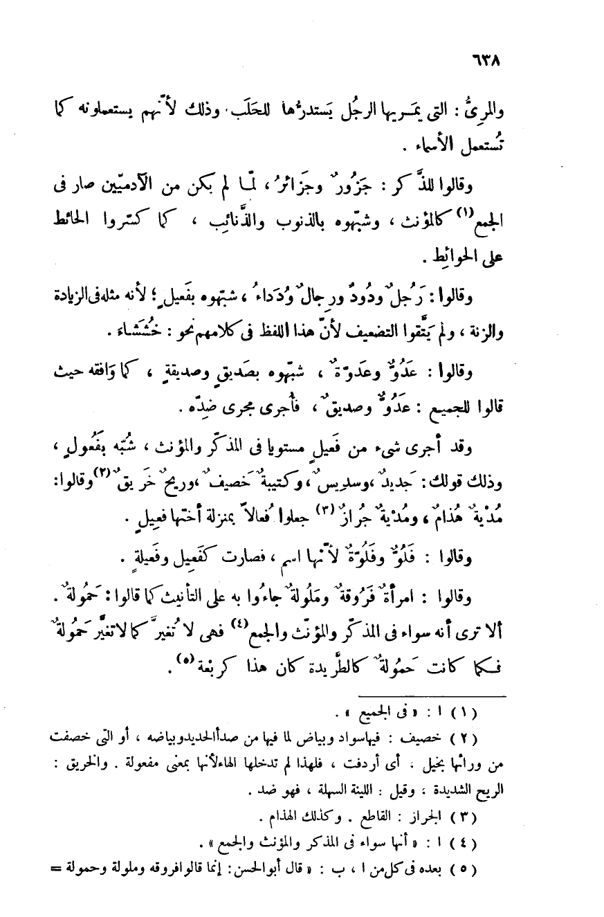 وقد أجري شيء من فعيلٍ مستويا في المذكر والمؤنث، شبه بفعولٍ، وذلك قولك: جديدٌ، وسديسٌ، وكتيبةٌ خصيفٌ، وريحٌ خريقٌ وقالوا: مديةٌ هذامٌ، ومديةٌ جرازٌ جعلوا فعالاً بمنزلة أختها فعيل. ٍ وقالوا: فلوٌّ فلوّةٌ لأنها اسم، فصارت كفعيل وفعيلةٍ.