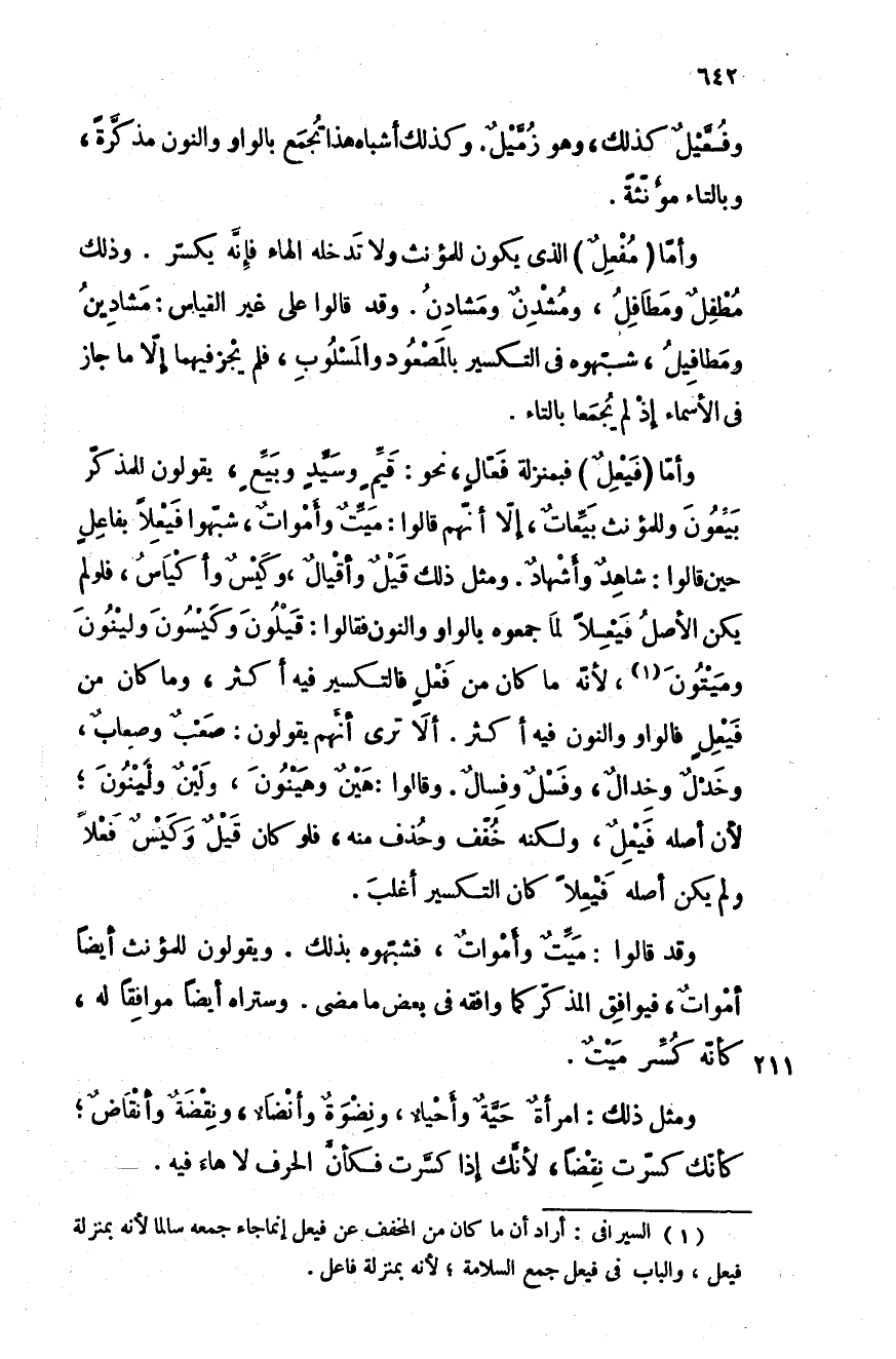 وأما فيعلٌ فبمنزلة فعّالٍ، نحو: قيِّمٍ وسيِّدٍ وبيِّع، يقولون للمذكر بيعون وللمؤنث بيعاتٌ، إلا أنهم قالوا: ميِّتٌ وأمواتٌ، شبهوا فيعلاً بفاعلٍ حين قالوا: شاهدٌ وأشهادٌ. ومثل ذلك قيلٌ وأقيالٌ، وكيسٌ وأكياسٌ، فلو لم يكن الأصل فيعلاً لما جمعوه بالواو وانون فقالوا: قيلون وكيسون ولينون وميتون، لأنه ما كان من فعلٍ فالتكسير فيه أكثر، وما كان من فيعلٍ فالواو والنون فيه أكثر. ألا ترى أنَّهم يقولون: صعبٌ وصعابٌ، وخدلٌ وخدالٌ، وفسلٌ وفسالٌ، وقالوا: هينٌ وهينون، ولينٌ ولينون؛ لأن أصله فيعلٌ ولكنه خفف وحذف منه فلو كان قيل وكيس فعلا لم يكن أصلاً فعيلاً كان التكسير أغلب.