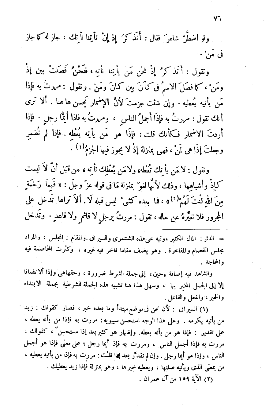 وتقول: أتذكر إذ نحن من يأتنا نأته، فنحن فصلت بين إذ ومن، كما فصل الاسم في كان بين كان ومن. وتقول: مررت به فإذا من يأتيه يعطيه. وإن شئت جزمت لأن الإضمار يحسن هاهنا. ألا ترى أنك تقول: مررت به فإذا أجمل الناس، ومررت به فإذا أيما رجلٍ. فإذا أردت الإضمار فكأنك قلت: فإذا هو من يأته يعطه. فإذا لم تضمر وجعلت إذا هي لمن، فهي بمنزلة إذ لا يجوز فيها الجزم.