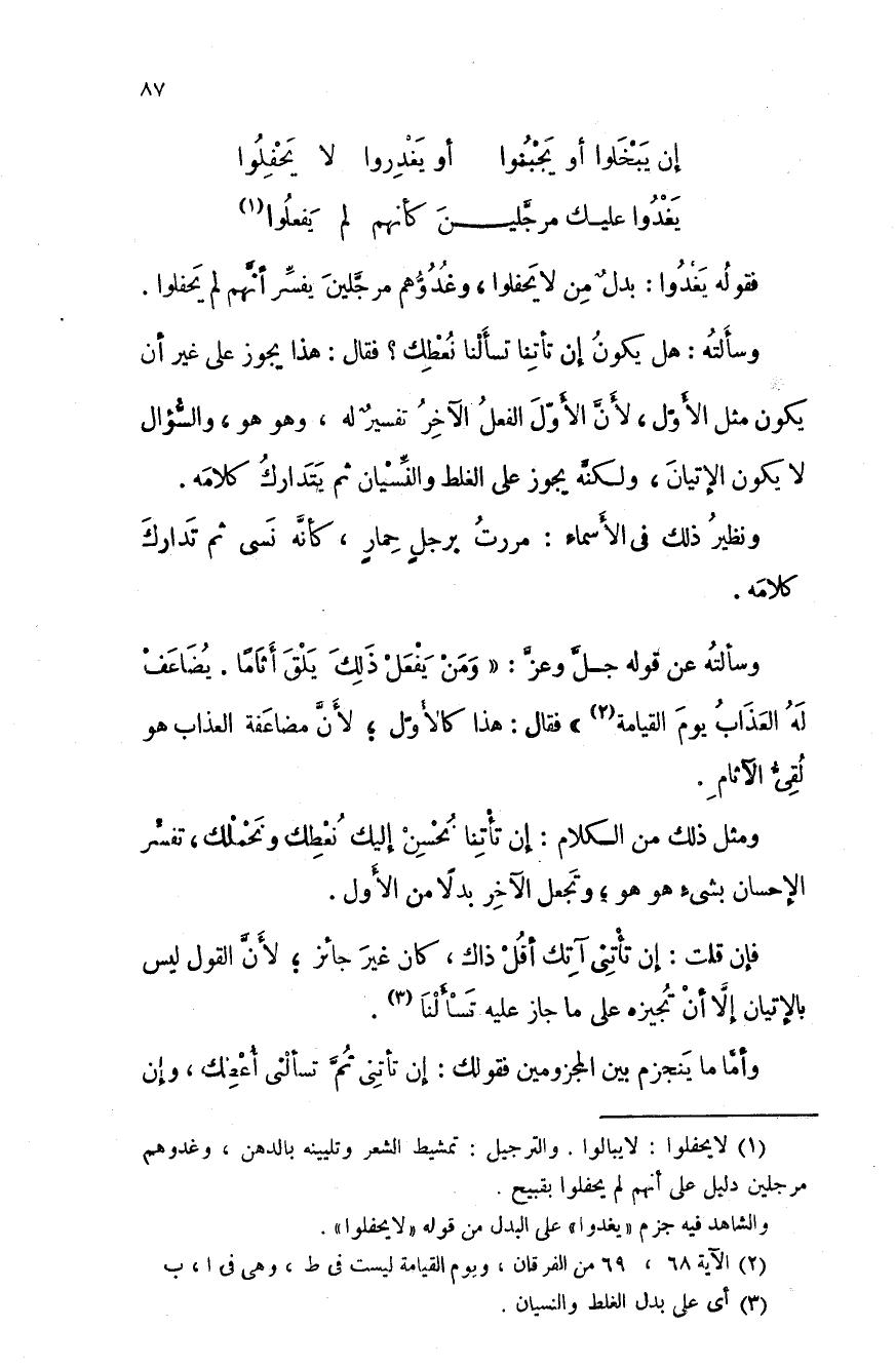 وسألته: هل يكون إن تأتنا تسألنا نعطك؟ فقال: هذا يجوز على غير أن يكون مثل الأول، لأنَّ الأول الفعل الآخر تفسيرٌ له، وهو هو، والسُّوال لا يكون الإتيان، ولكنَّه يجوز على الغلط والنَّسيان ثم يتدارك كلامه.