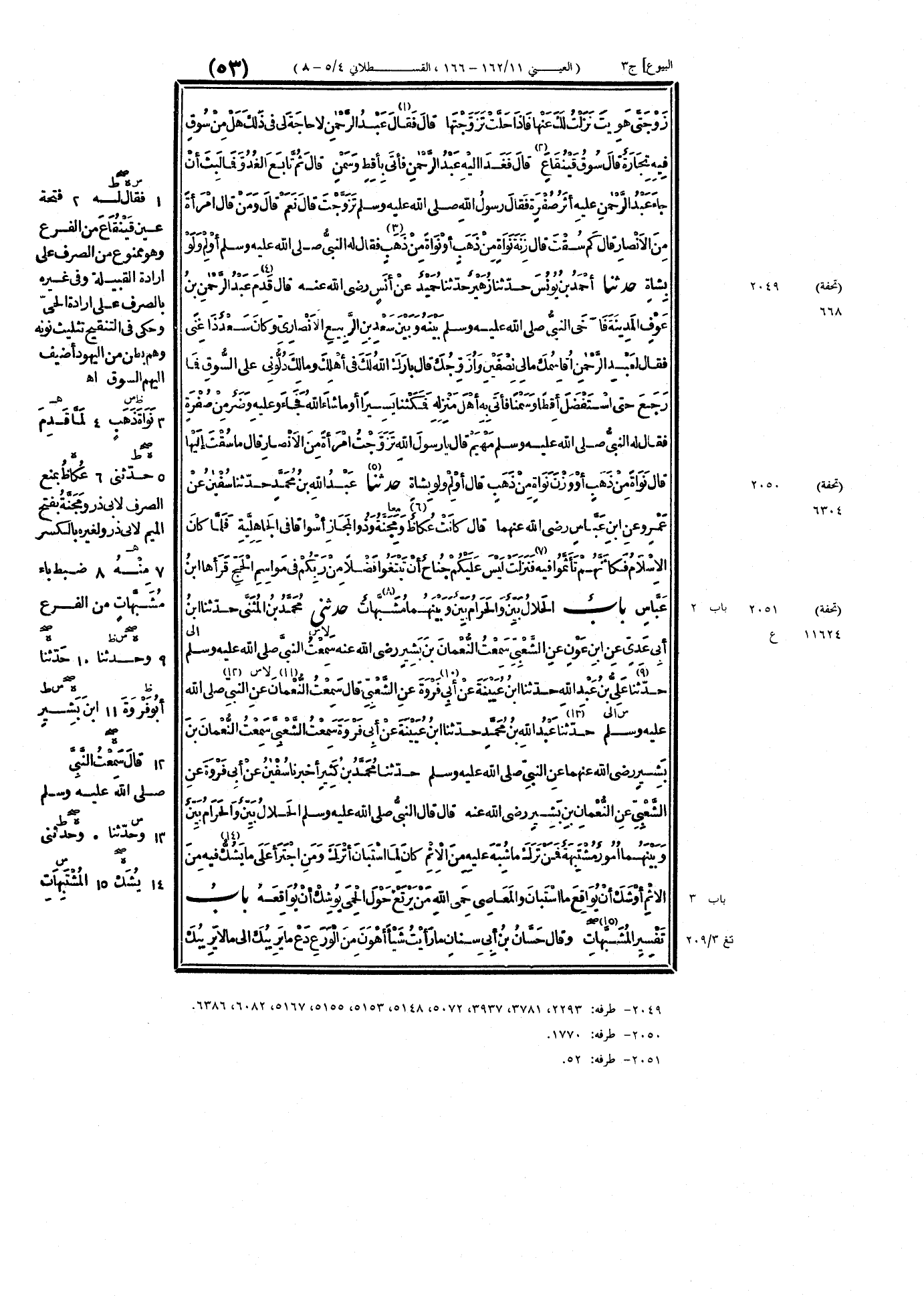 ٢٠٥١ - حَدَّثَنِي مُحَمَّدُ بْنُ المُثَنَّى، حَدَّثَنَا ابْنُ أَبِي عَدِيٍّ، عَنِ ابْنِ عَوْنٍ، عَنِ الشَّعْبِيِّ، سَمِعْتُ النُّعْمَانَ بْنَ بَشِيرٍ رَضِيَ اللَّهُ عَنْهُ، سَمِعْتُ النَّبِيَّ صَلَّى اللهُ عَلَيْهِ وَسَلَّمَ، وحَدَّثَنَا عَلِيُّ بْنُ عَبْدِ اللَّهِ، حَدَّثَنَا ابْنُ عُيَيْنَةَ، حَدَّثَنَا أَبُو فَرْوَةَ، عَنِ الشَّعْبِيِّ، قَالَ: سَمِعْتُ النُّعْمَانَ بْنَ بَشِيرٍ، قَالَ: سَمِعْتُ النَّبِيَّ صَلَّى اللهُ عَلَيْهِ وَسَلَّمَ، وحَدَّثَنَا عَبْدُ اللَّهِ بْنُ مُحَمَّدٍ، حَدَّثَنَا ابْنُ عُيَيْنَةَ، عَنْ أَبِي فَرْوَةَ، سَمِعْتُ الشَّعْبِيَّ، سَمِعْتُ النُّعْمَانَ بْنَ بَشِيرٍ رَضِيَ اللَّهُ عَنْهُمَا، عَنِ النَّبِيِّ صَلَّى اللهُ عَلَيْهِ وَسَلَّمَ، حَدَّثَنَا مُحَمَّدُ بْنُ كَثِيرٍ، أَخْبَرَنَا سُفْيَانُ، عَنْ أَبِي فَرْوَةَ، عَنِ الشَّعْبِيِّ، عَنِ النُّعْمَانِ بْنِ بَشِيرٍ رَضِيَ اللَّهُ عَنْهُ، قَالَ: قَالَ النَّبِيُّ صَلَّى اللهُ عَلَيْهِ وَسَلَّمَ: «الحَلَالُ بَيِّنٌ، وَالحَرَامُ بَيِّنٌ، وَبَيْنَهُمَا أُمُورٌ مُشْتَبِهَةٌ، فَمَنْ تَرَكَ مَا شُبِّهَ عَلَيْهِ مِنَ الإِثْمِ، كَانَ لِمَا اسْتَبَانَ أَتْرَكَ، وَمَنِ اجْتَرَأَ عَلَى مَا يَشُكُّ فِيهِ مِنَ الإِثْمِ، أَوْشَكَ أَنْ يُوَاقِعَ مَا اسْتَبَانَ، وَالمَعَاصِي حِمَى اللَّهِ مَنْ يَرْتَعْ حَوْلَ الحِمَى يُوشِكُ أَنْ يُوَاقِعَهُ»
