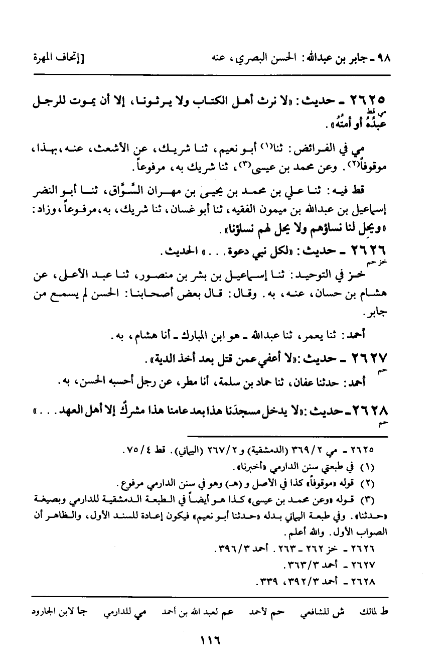 2625 - حَدِيثُ (مي قط) : " لا نَرِثُ أَهْلَ الْكِتَابِ وَلا يَرِثُونَا، إِلا أَنْ يَمُوتَ لِلرَّجُلِ عَبْدُهُ أَوْ أَمَتُهُ ".