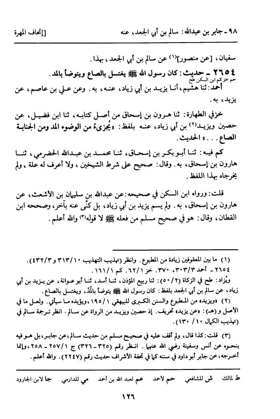 2654 - حَدِيثُ (حم خز كم ابْنِ السَّكَنِ طح) : كَانَ رَسُولُ اللَّهِ صَلَّى اللَّهُ عَلَيْهِ وَسَلَّمَ يَغْتَسِلُ بِالصَّاعِ وَيَتَوَضَّأُ بِالْمَدِّ.
