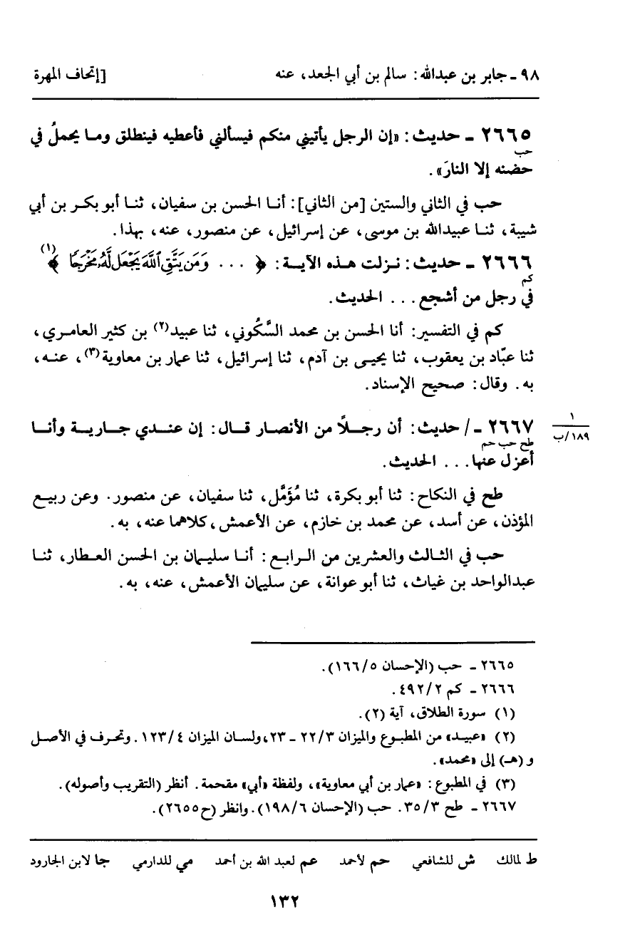 2665 - حَدِيثُ (حب) : " إِنَّ الرَّجُلَ يَأْتِينِي مِنْكُمْ فَيَسْأَلُنِي فَأُعْطِيهِ فَيَنْطَلِقُ، وَمَا يَحْمِلُ فِي حِضْنِهِ إِلا النَّارَ ".