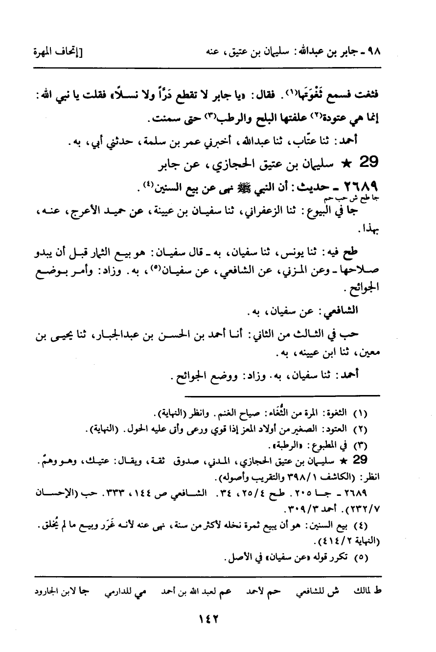 2689 - حَدِيثُ (جا طح ش حب حم) : أَنَّ النَّبِيَّ صَلَّى اللَّهُ عَلَيْهِ وَسَلَّمَ نَهَى عَنْ بَيْعِ السِّنِينَ.