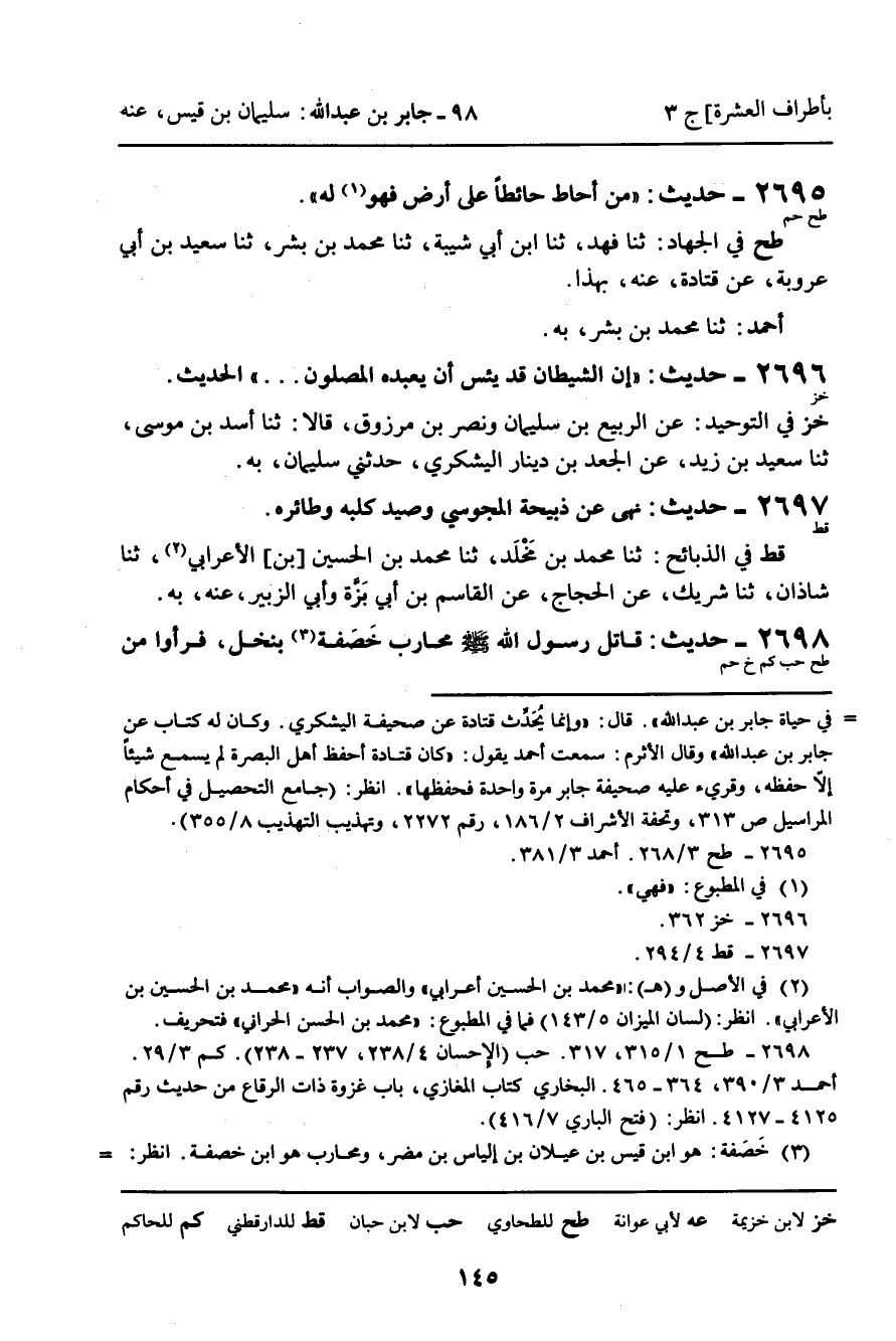 2698 - حَدِيثُ (طح حب كم خ حم) : قَاتَلَ رَسُولُ اللَّهِ صَلَّى اللَّهُ عَلَيْهِ وَسَلَّمَ مُحَارِبَ خَصَفَةَ بِنَخْلٍ، فَرَأَوْا مِنَ