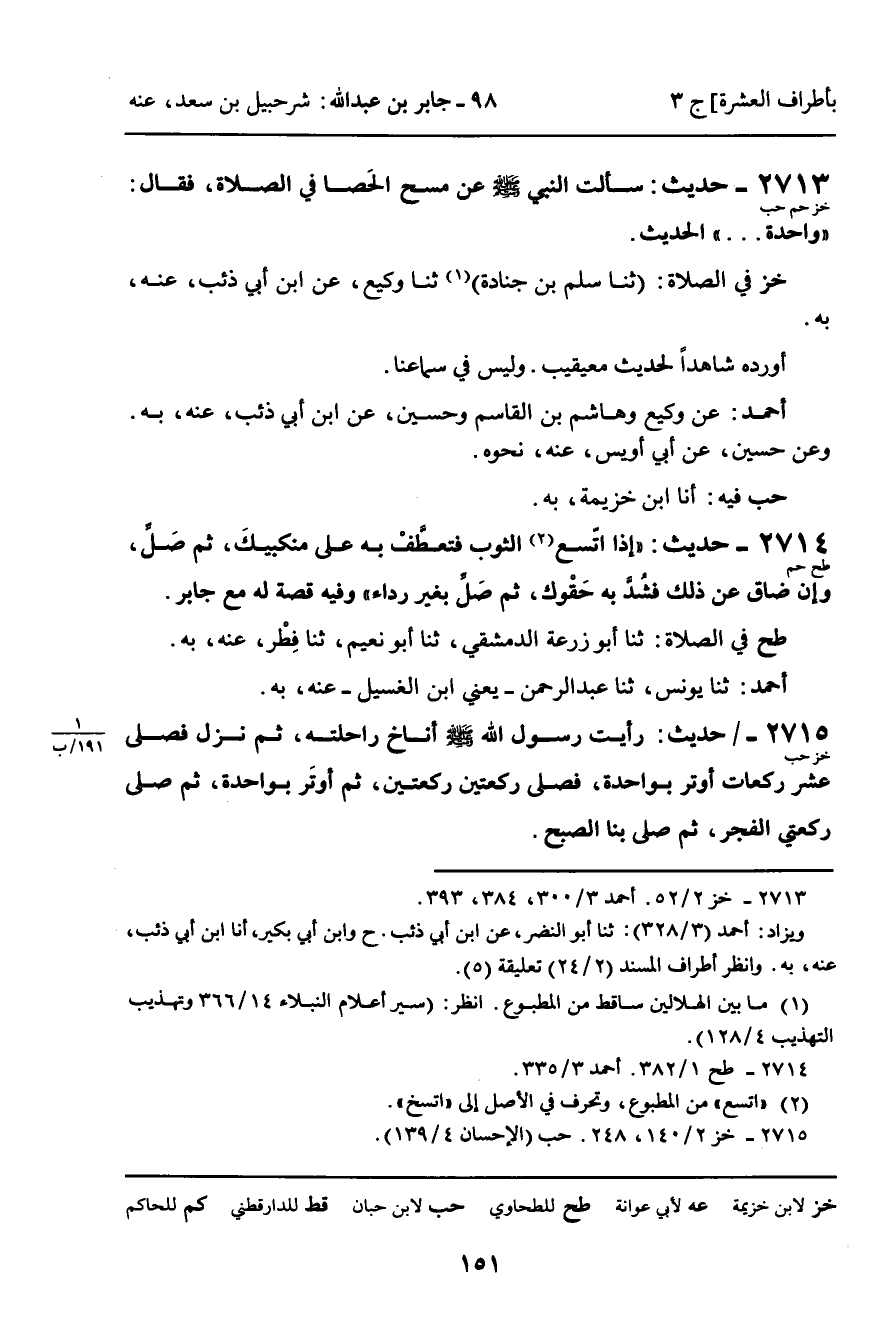 2715 - حَدِيثُ (خز حب) : رَأَيْتُ رَسُولَ اللَّهِ صَلَّى اللَّهُ عَلَيْهِ وَسَلَّمَ أَنَاخَ رَاحِلَتَهُ، ثُمَّ نَزَلَ فَصَلَّى عَشْرَ رَكَعَاتٍ أَوْتَرَ بِوَاحِدَةٍ، فَصَلَّى رَكْعَتَيْنِ رَكْعَتَيْنِ، ثُمَّ أَوْتَرَ بِوَاحِدَةٍ، ثُمَّ صَلَّى رَكْعَتَيِ الْفَجْرِ، ثُمَّ صَلَّى بِنَا الصُّبْحَ.