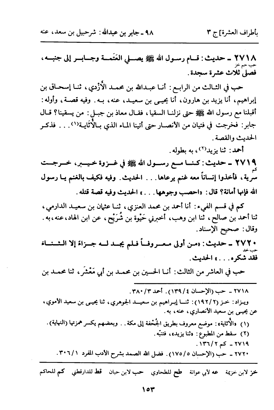(حب) فِي الثَّالِثِ مِنَ الرَّابِعِ: أنا عَبْدُ اللَّهِ بْنُ مُحَمَّدٍ الأَزْدِيُّ، ثنا إِسْحَاقُ بْنُ إِبْرَاهِيمَ، أنا يَزِيدُ بْنُ هَارُونَ، أنا يَحْيَى بْنُ سَعِيدٍ، عَنْهُ، بِهِ. وَفِيهِ قِصَّةٌ، وَأَوَّلُهُ: أَقْبَلْنَا مَعَ رَسُولِ اللَّهِ صَلَّى اللَّهُ عَلَيْهِ وَسَلَّمَ حَتَّى نَزَلْنَا السُّقْيَا، فَقَالَ مُعَاذُ بْنُ جَبَلٍ: مَنْ يَسْقِينَا؟ قَالَ جَابِرٌ: فَخَرَجْتُ فِي فِتْيَانٍ مِنَ الأَنْصَارِ حَتَّى أَتَيْنَا الْمَاءَ الَّذِي بِالأَثَايَةِ. . .؛ فَذَكَرَ الْحَدِيثَ وَالْقِصَّةَ.