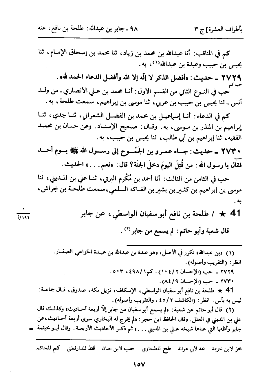 (حب) فِي النَّوْعِ الثَّانِي مِنَ الْقِسْمِ الأَوَّلِ: أنا مُحَمَّدُ بْنُ عَلِيٍّ الأَنْصَارِيُّ، مِنْ وَلَدِ أَنَسٍ، ثنا يَحْيَى بْنُ حَبِيبِ بْنِ عَرَبِيٍّ، ثنا مُوسَى بْنُ إِبْرَاهِيمَ، سَمِعْتُ طَلْحَةَ، بِهِ.